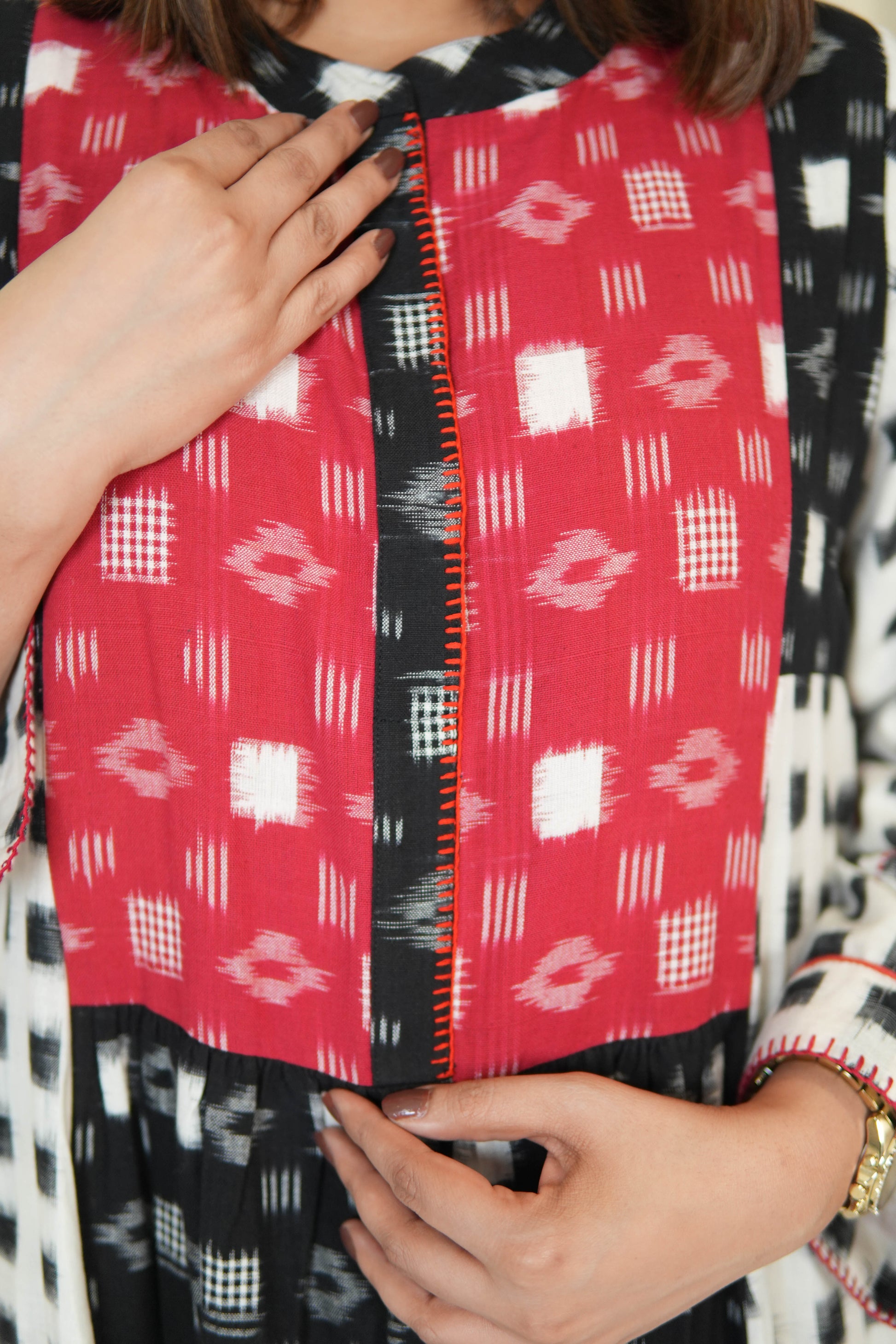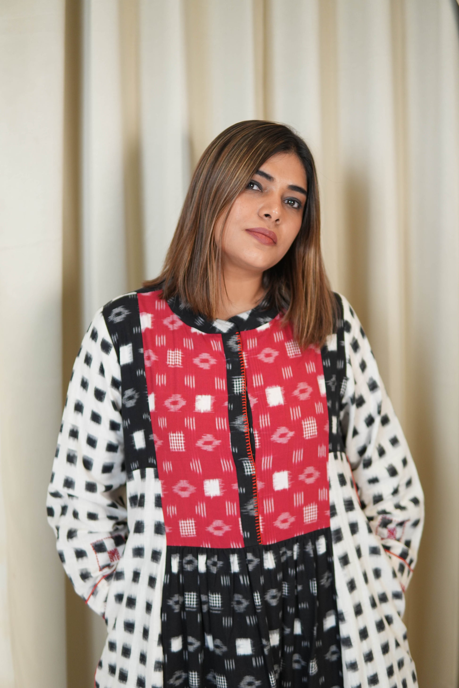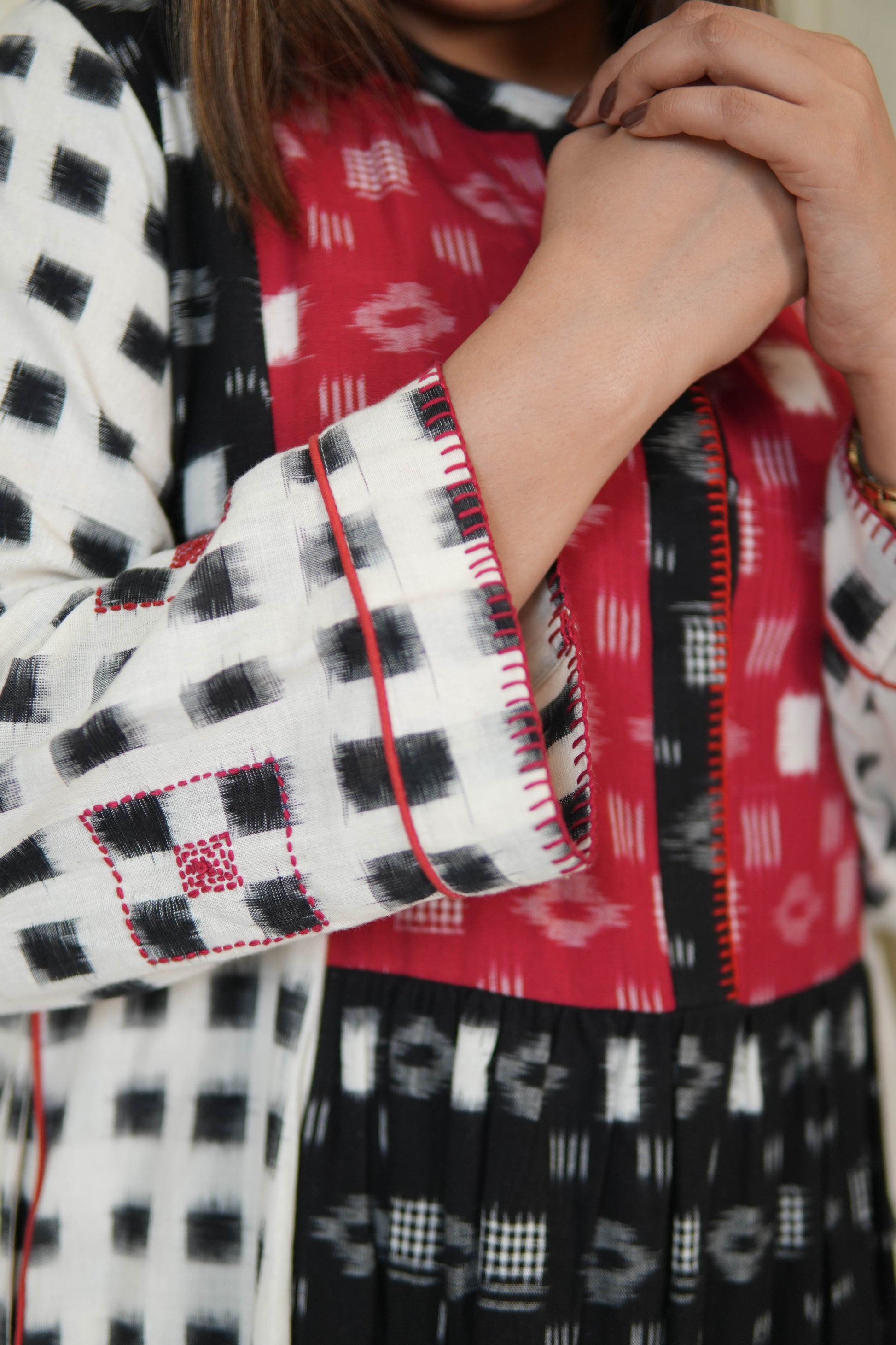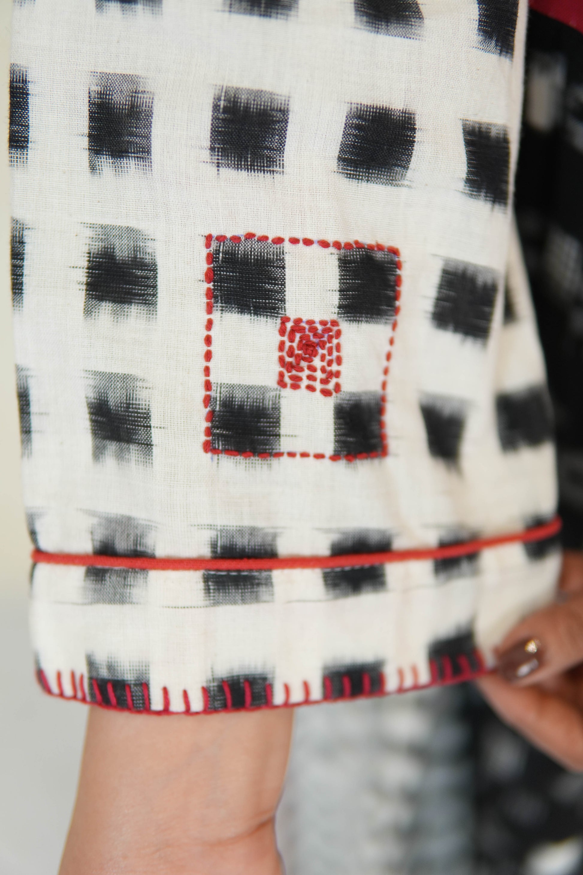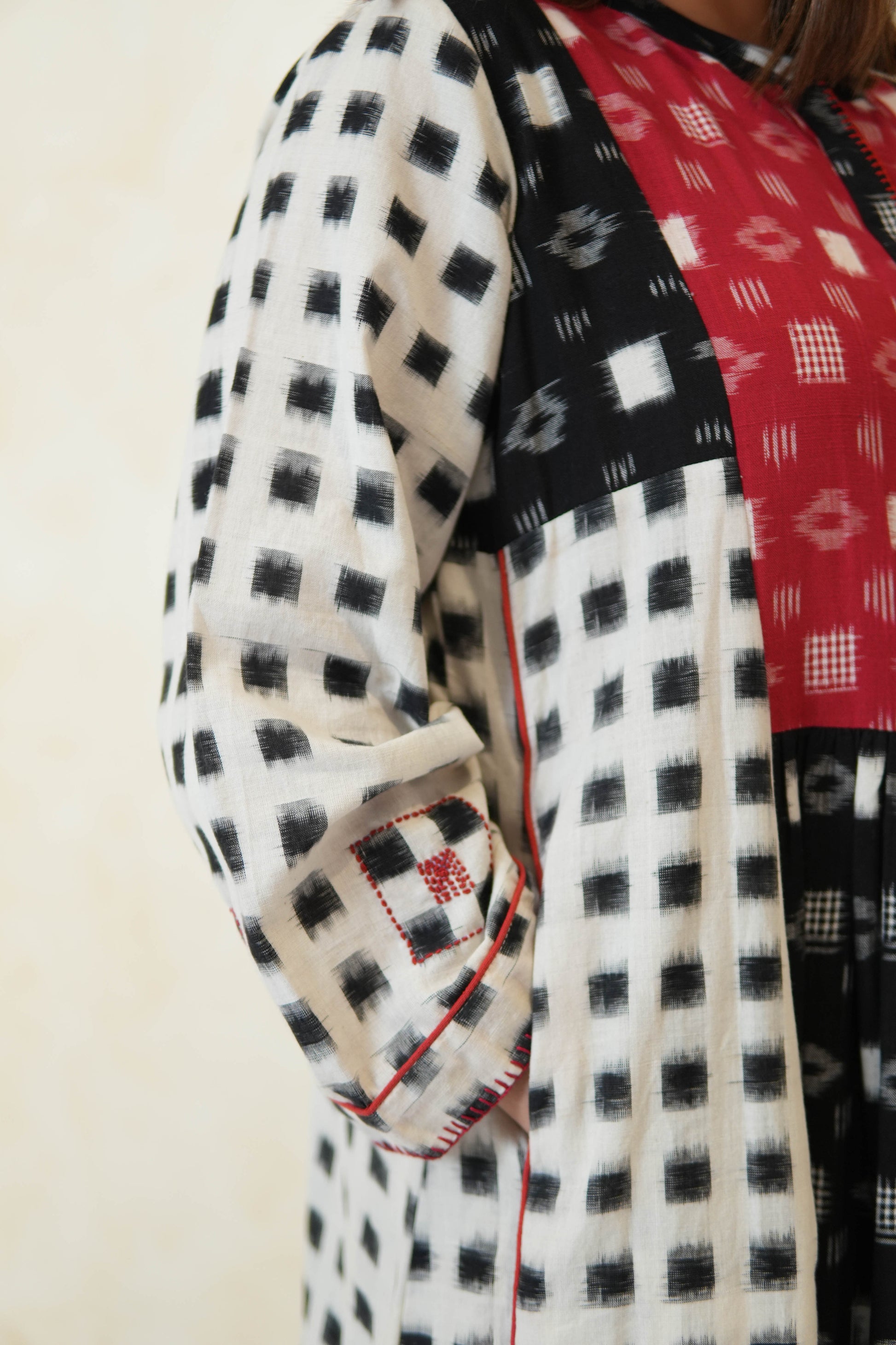 The collar and sleeve edges are enhanced with organza, lending a textural contrast that elevates the Ikat weave. Full sleeves with detailed cuffs balance functionality with elegance, while side panels in monochrome Ikat grids lend depth and movement to the garment.