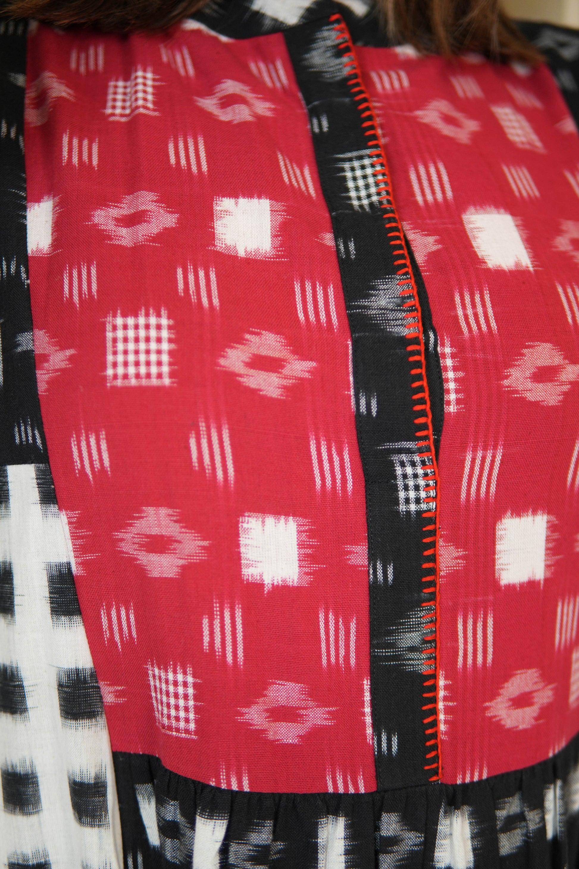 The Rangrez Ikkat Maxi is a celebration of artisanal craft and contemporary ease. Handwoven in mercerised cotton Ikkat, the dress showcases a striking play of geometric and abstract motifs in black, white, and deep madder red, arranged in bold panels.
