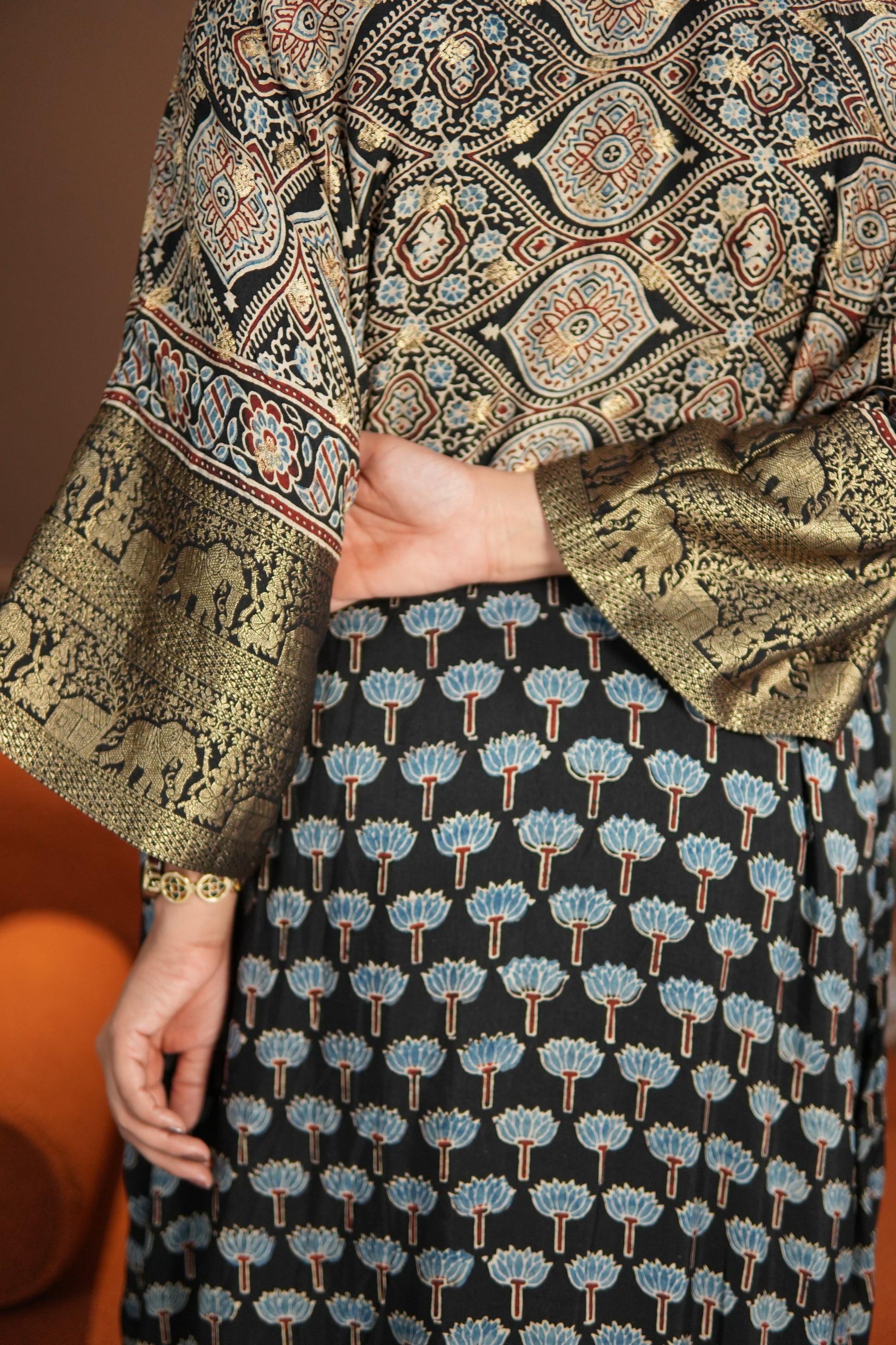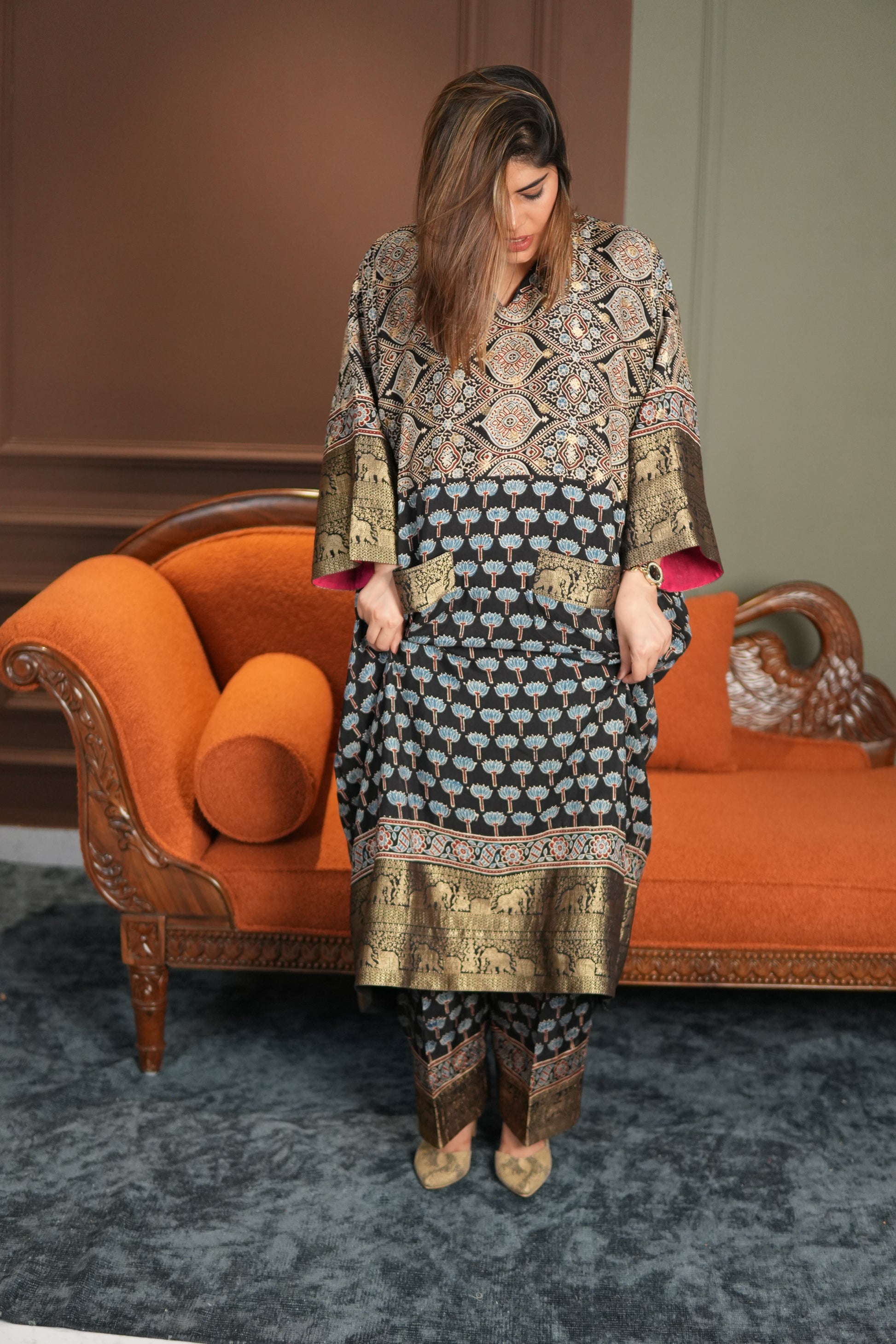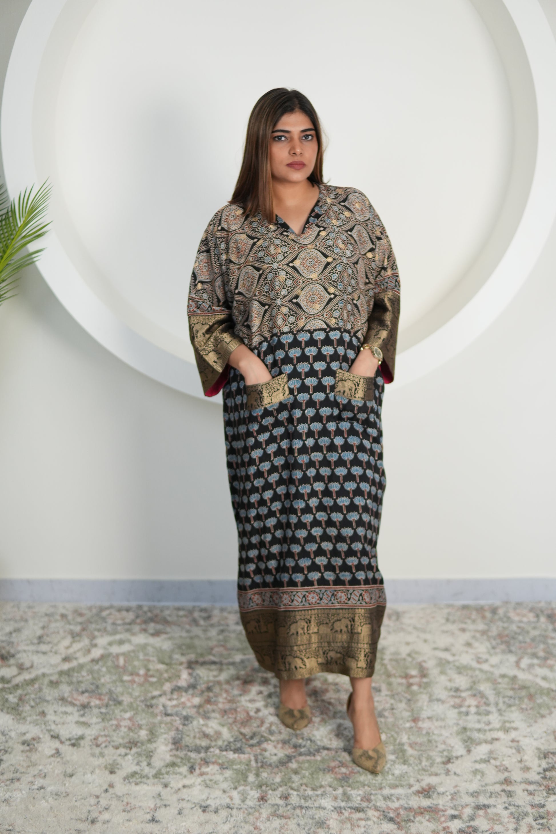 Celebrate the season in style with Chand Jhola, a breathtaking anti-fit jhola dress crafted from luxurious Dola Silk Ajrakh fabric. Lightweight, durable, and designed for comfort, this dress ensures you can revel in the festivities with ease and grace.
