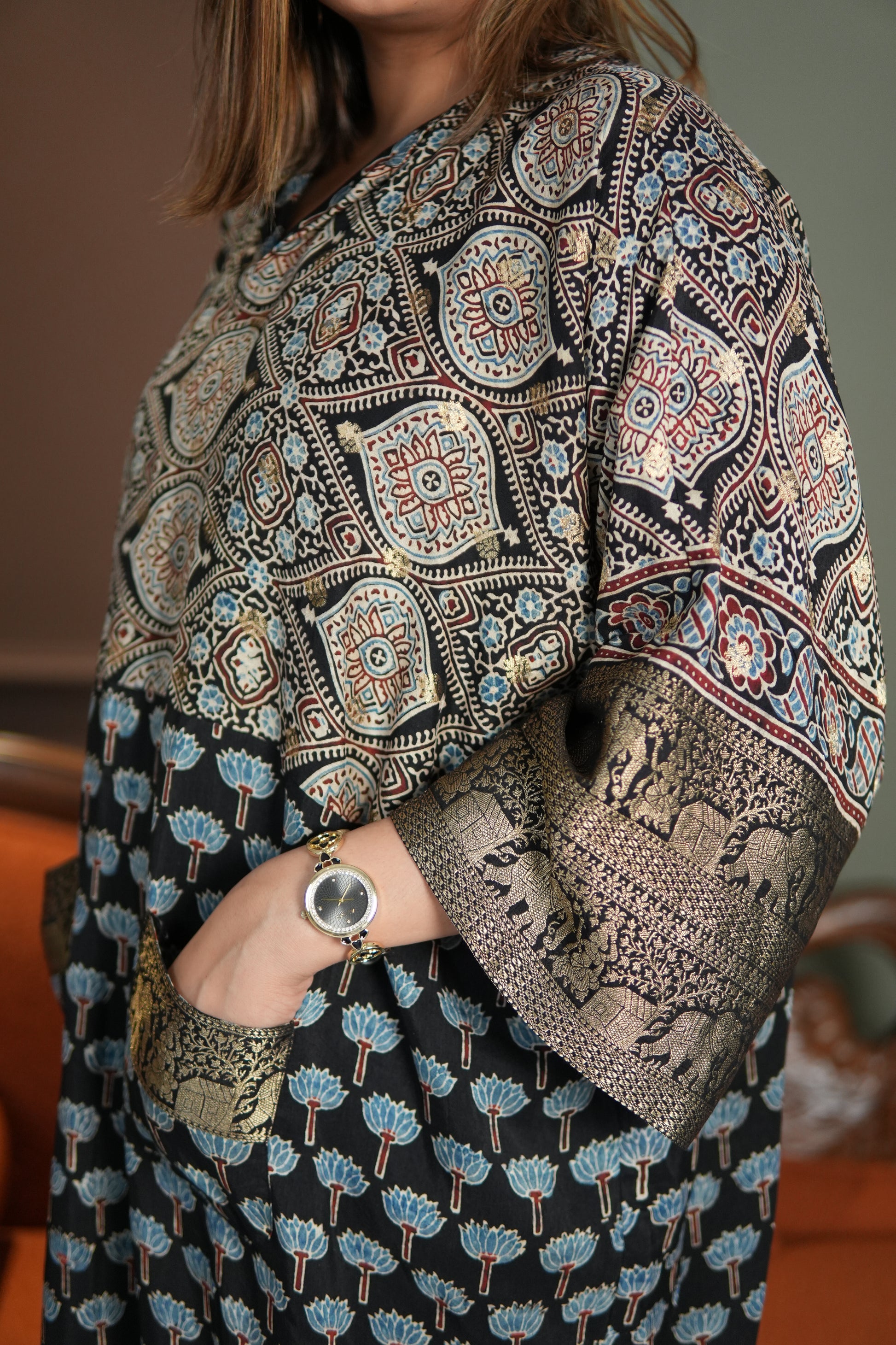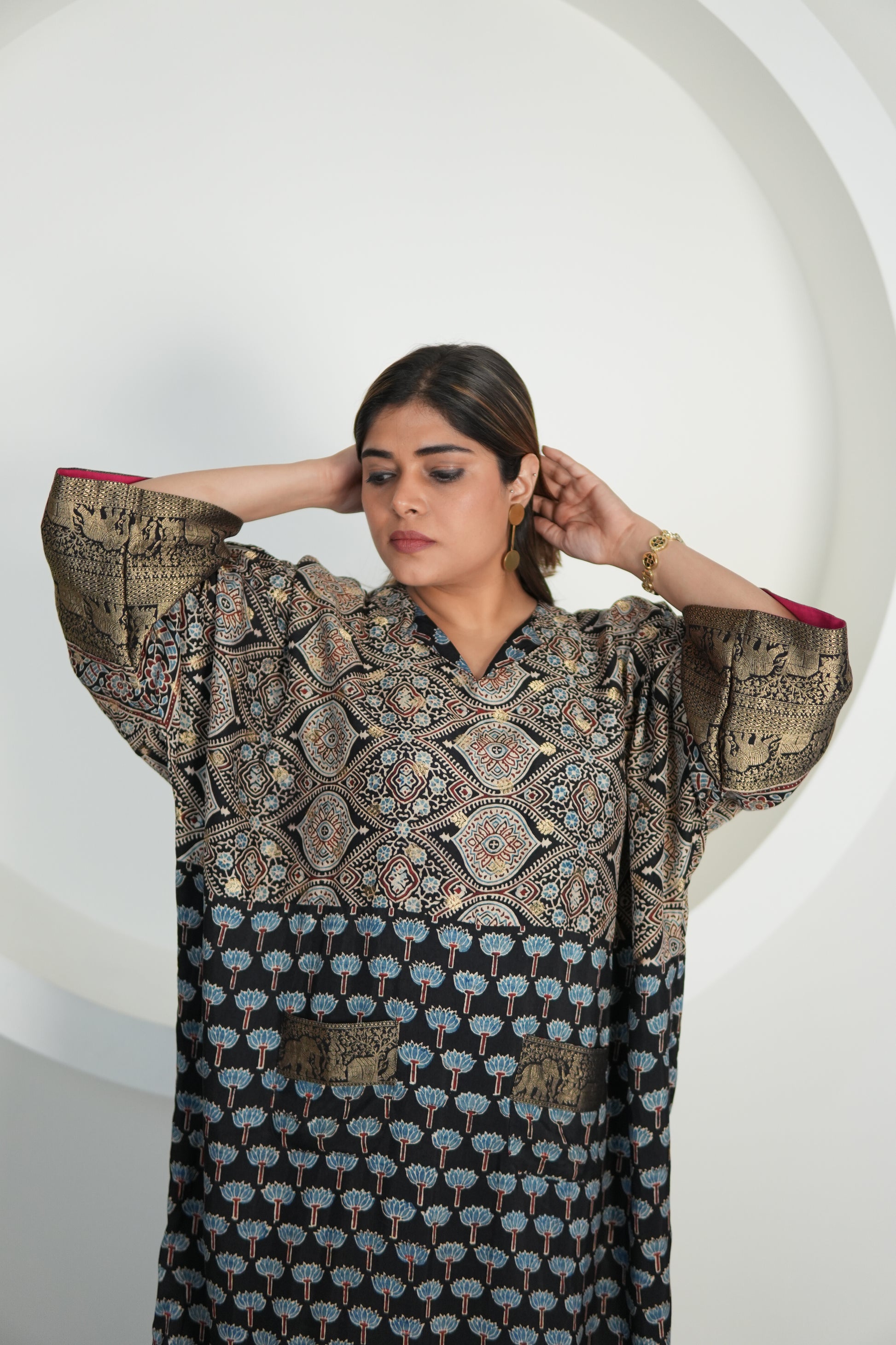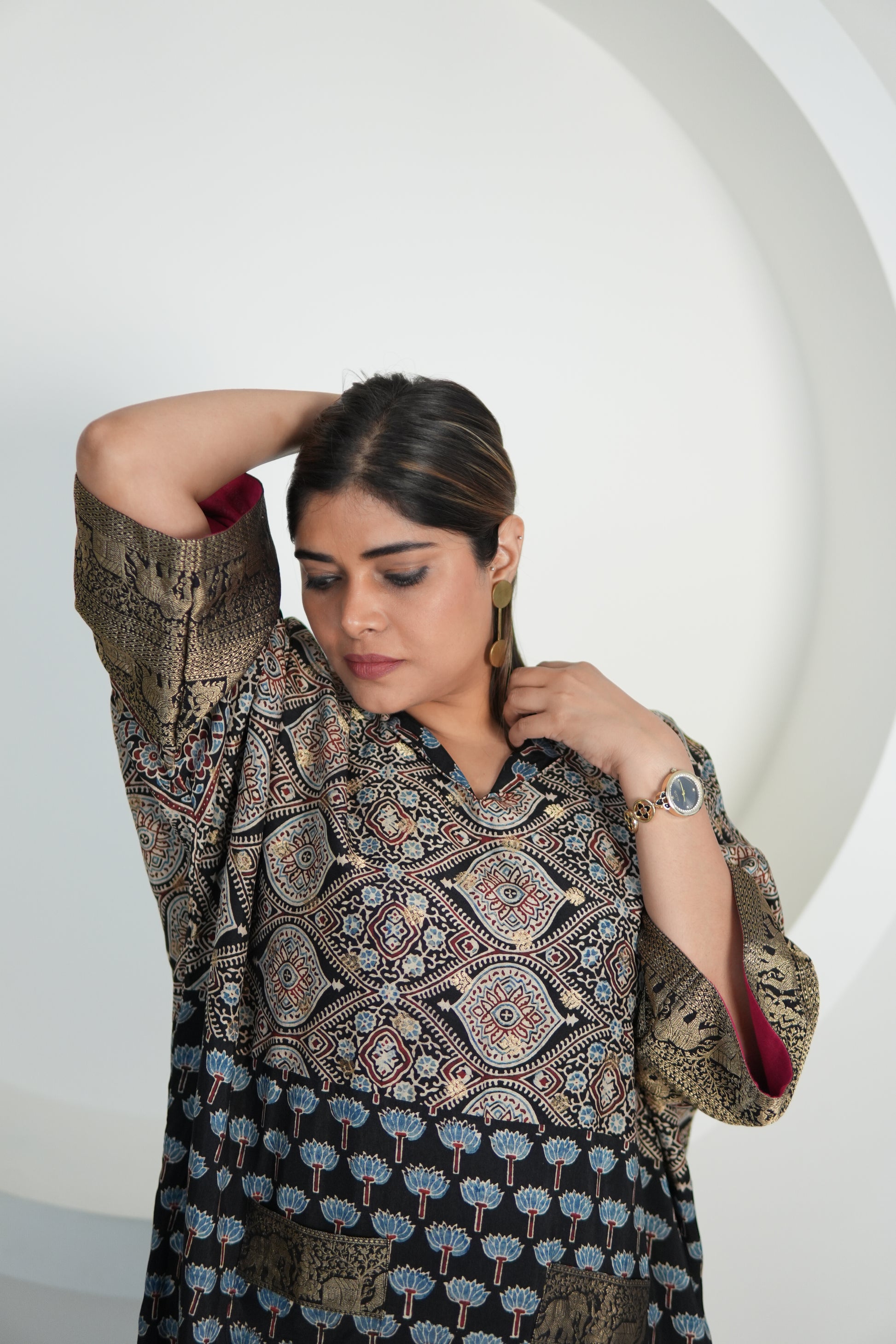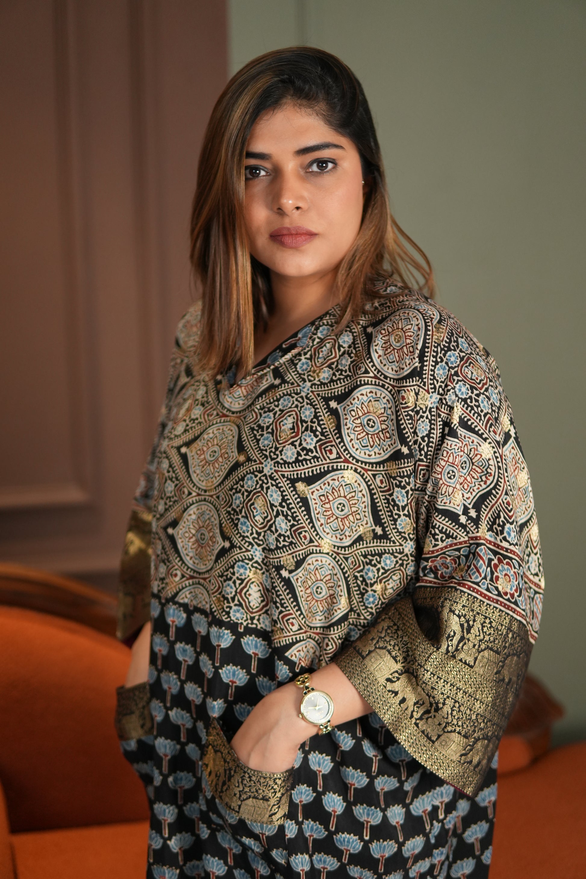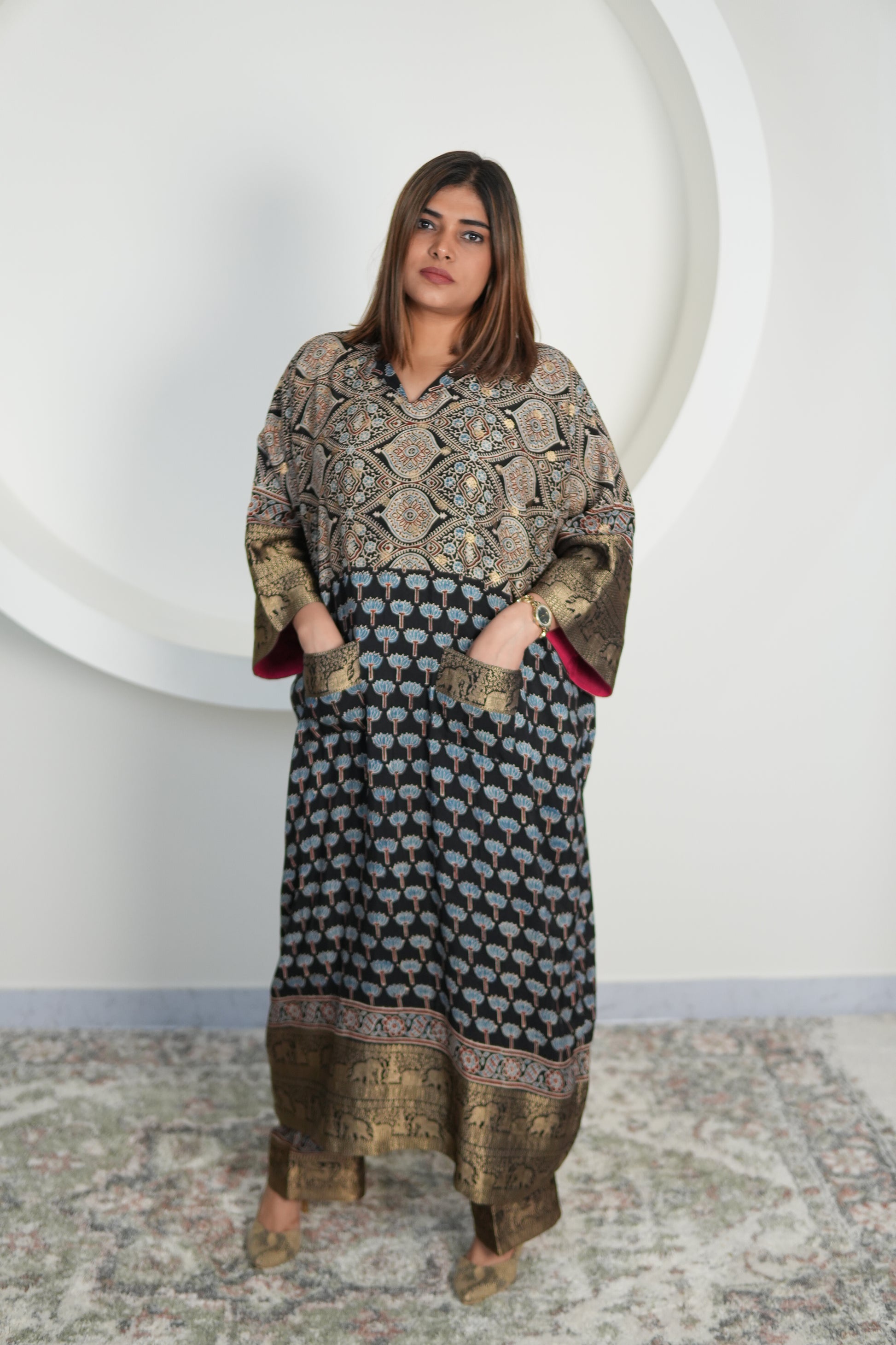 The hemline and cuffs are enriched with Banarasi brocade borders, woven with resplendent motifs of elephants and floral jaal, adding layers of opulence and a touch of Mughal grandeur. The relaxed fit makes it a versatile piece — pair it with the co-ordinated straight pants for an elevated traditional look, or wear it solo as a statement dress with sneakers for a modern, street-style edge.
