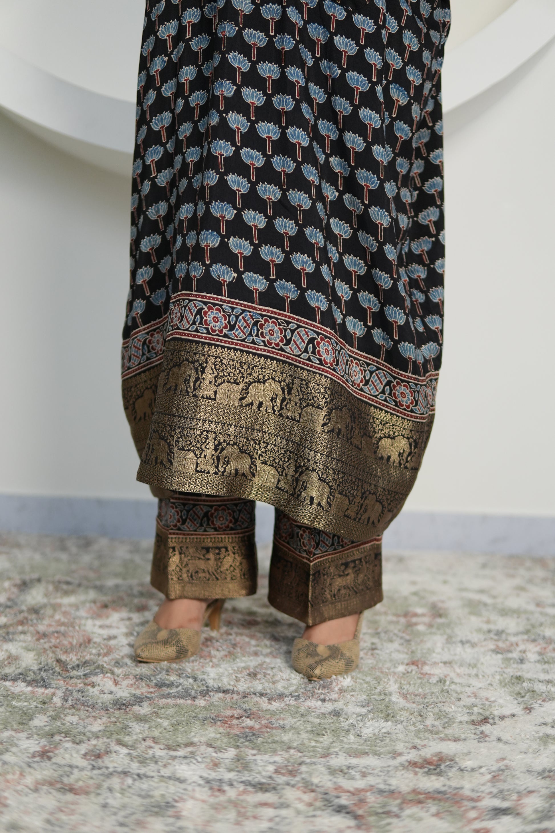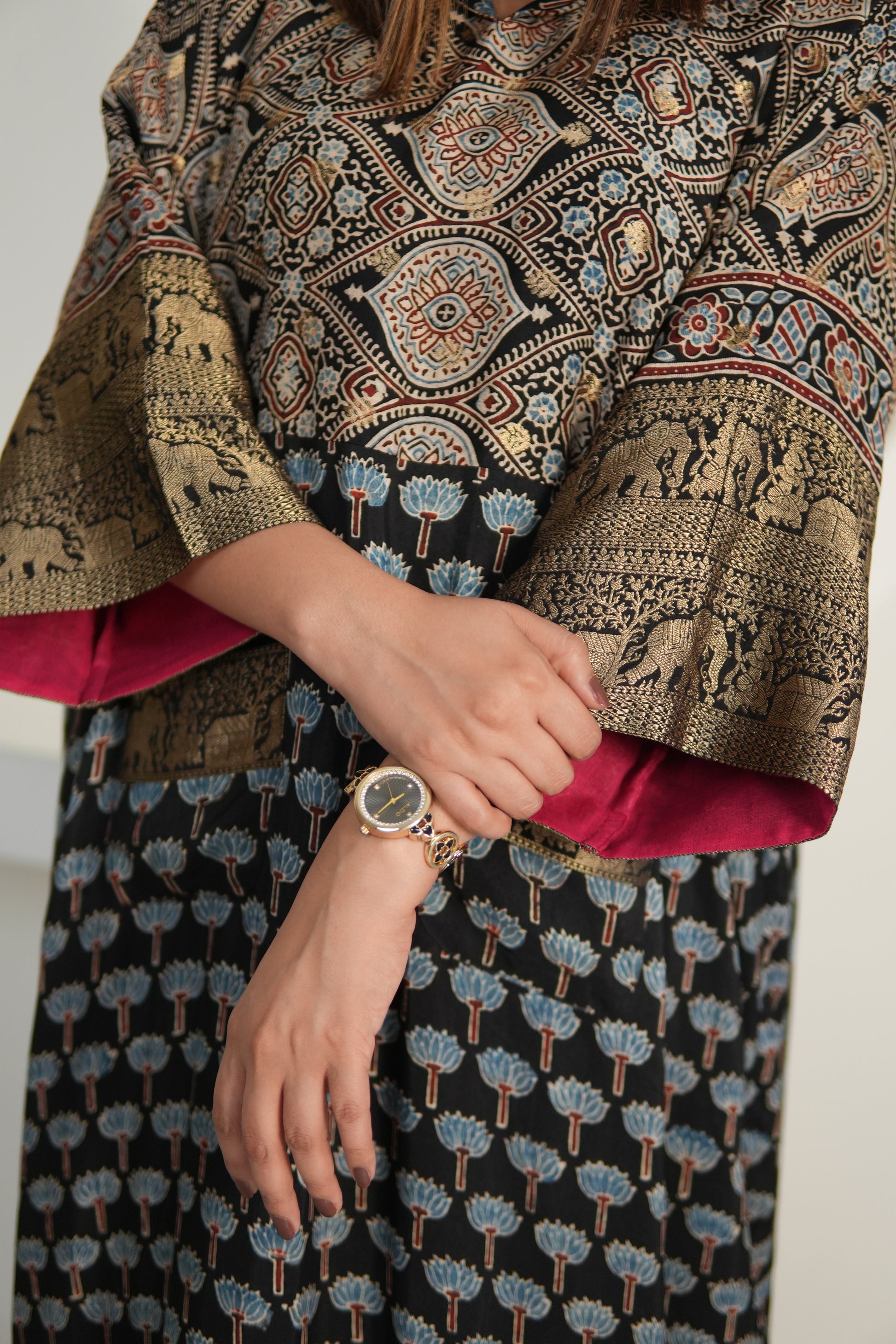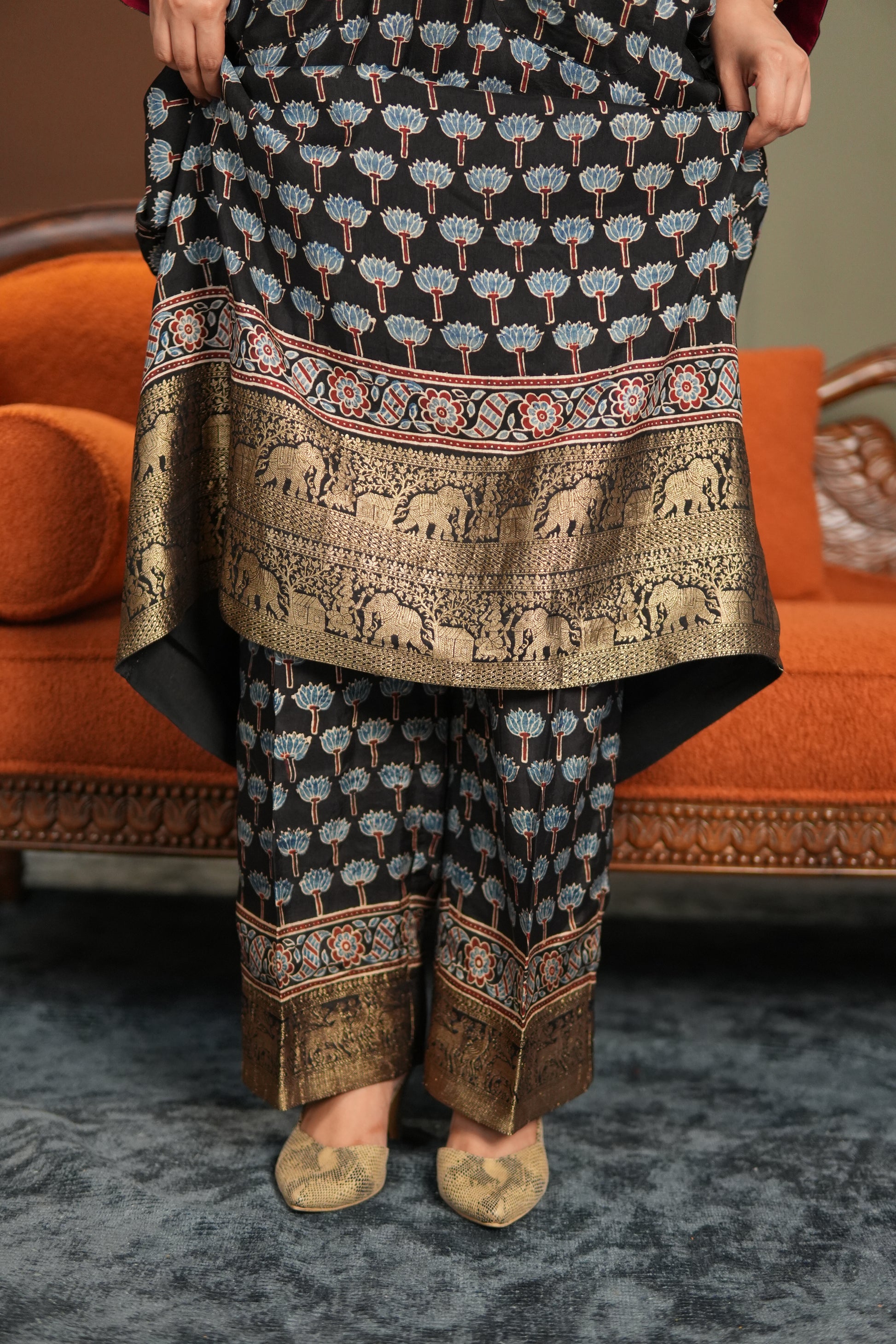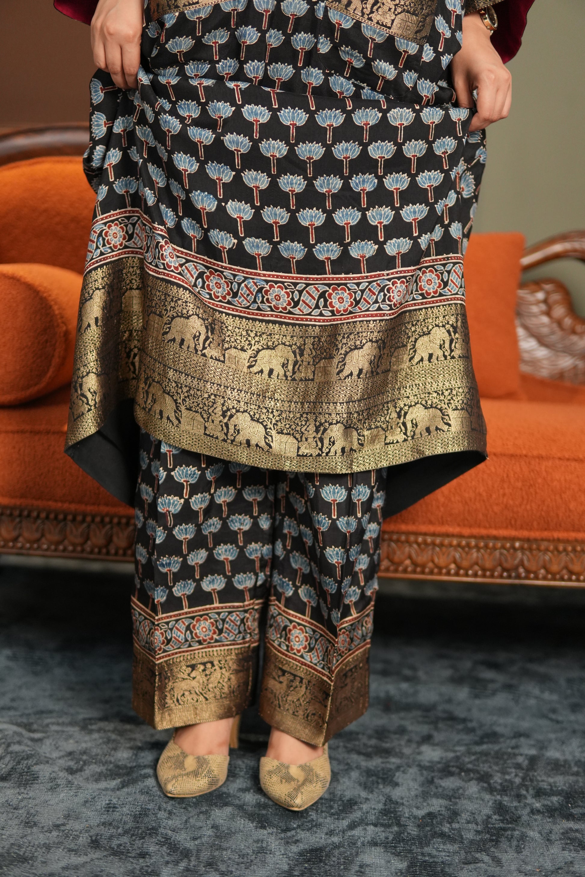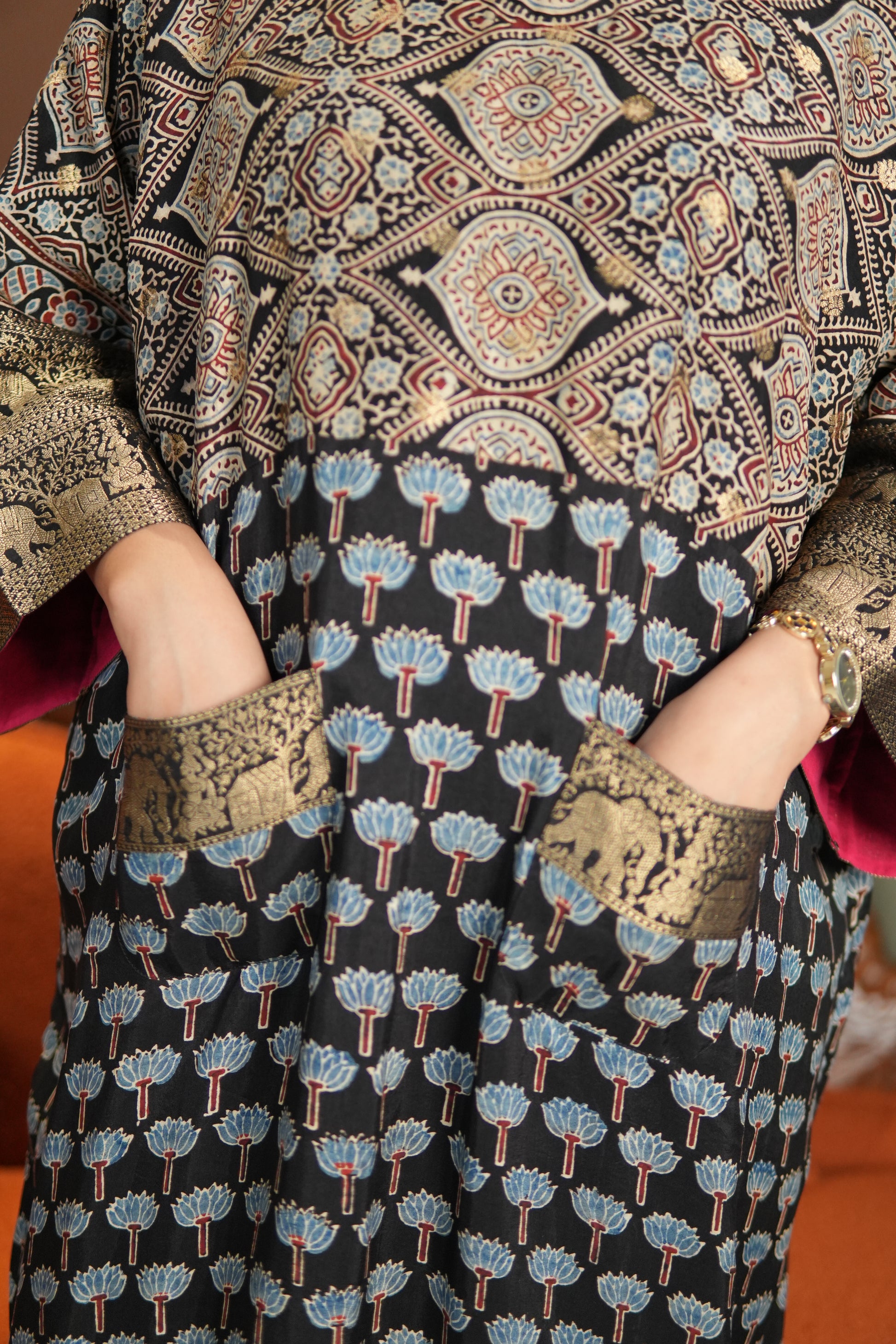 The hemline and cuffs are enriched with Banarasi brocade borders, woven with resplendent motifs of elephants and floral jaal, adding layers of opulence and a touch of Mughal grandeur. The relaxed fit makes it a versatile piece — pair it with the co-ordinated straight pants for an elevated traditional look, or wear it solo as a statement dress with sneakers for a modern, street-style edge.