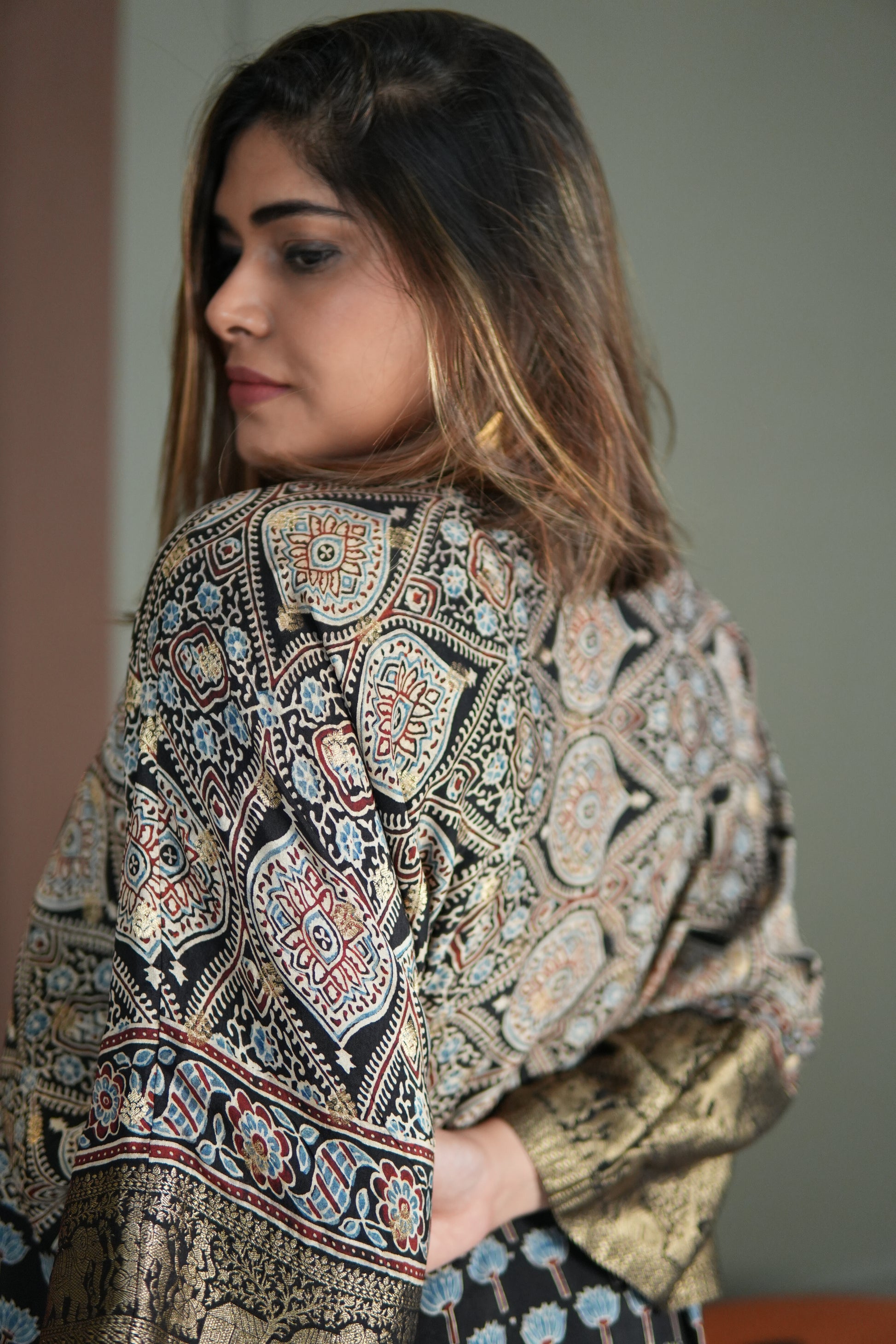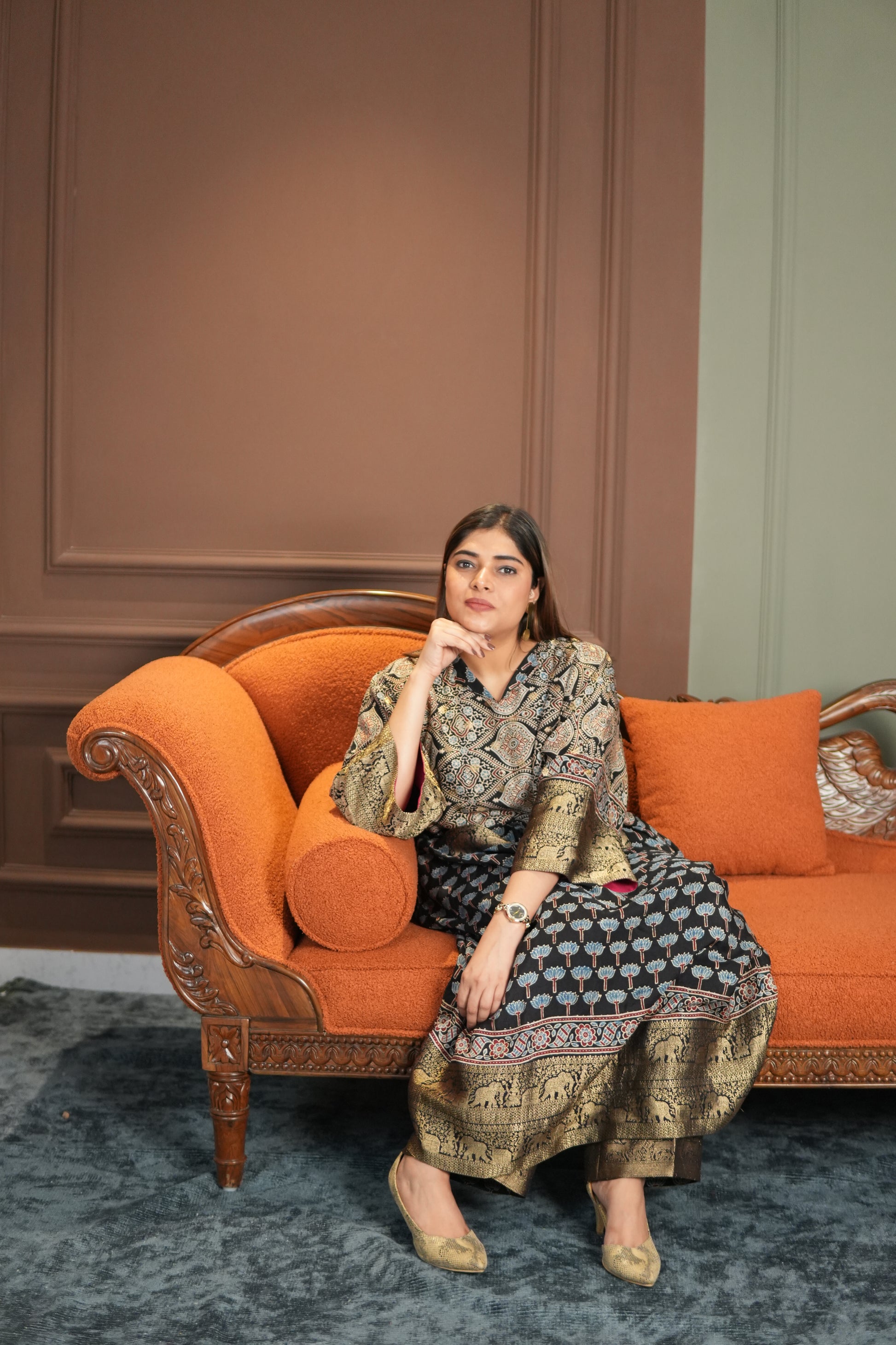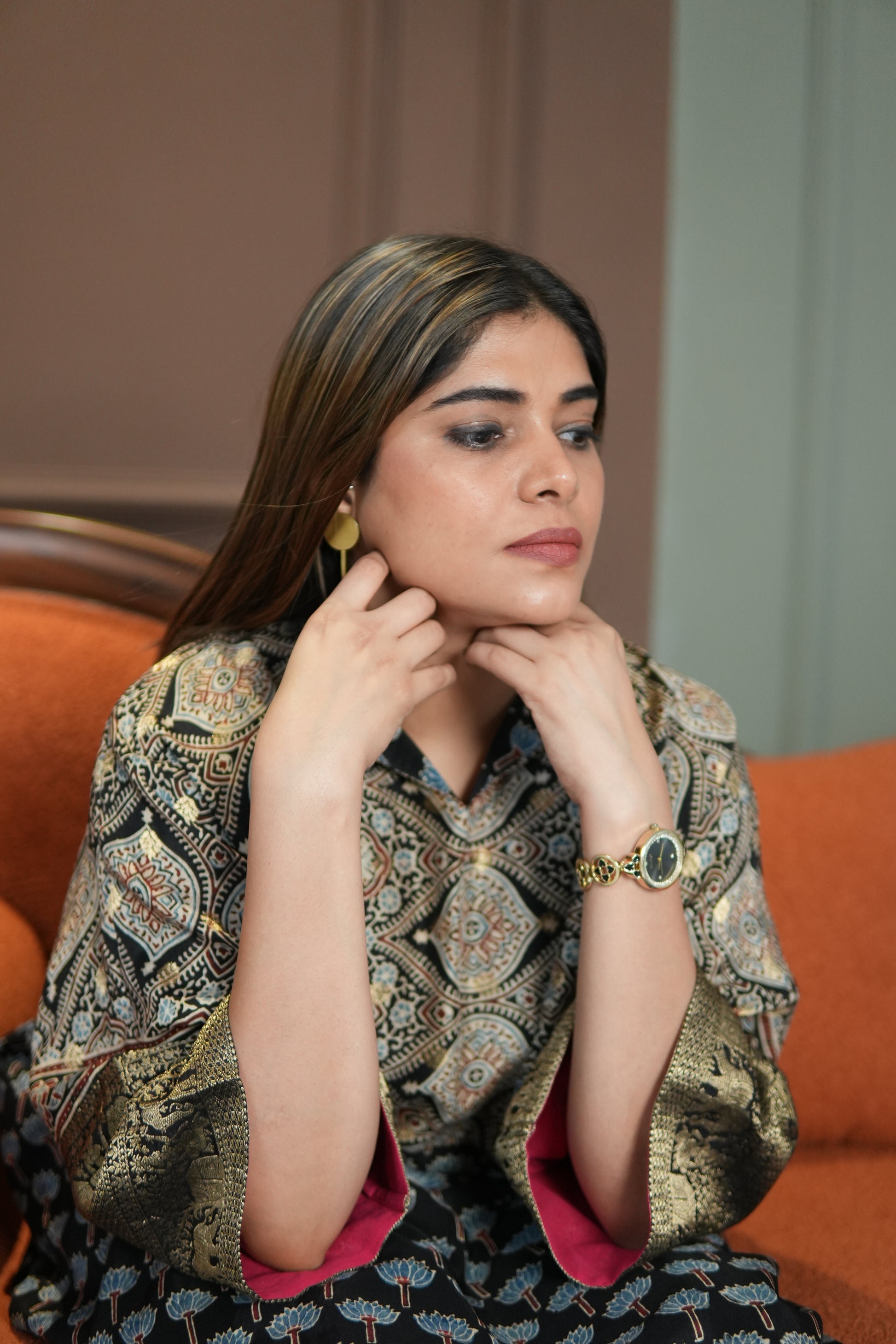 Opt for heritage jewellery — temple jhumkas or antique kadas — to enhance the Ajrakh and brocade interplay.