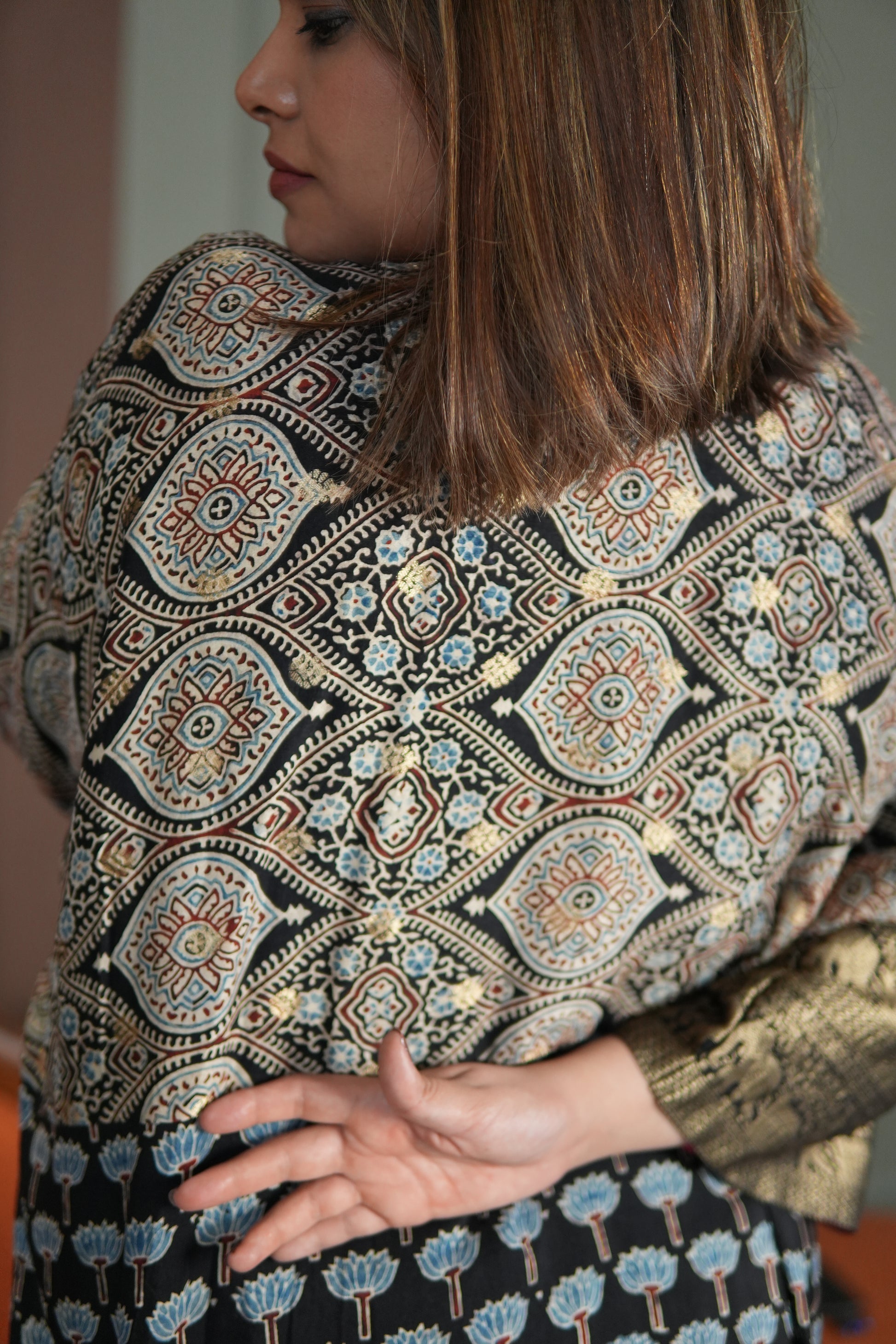 Introducing Chand Jhola: A Festive Dola Silk Ajrakh Masterpiece