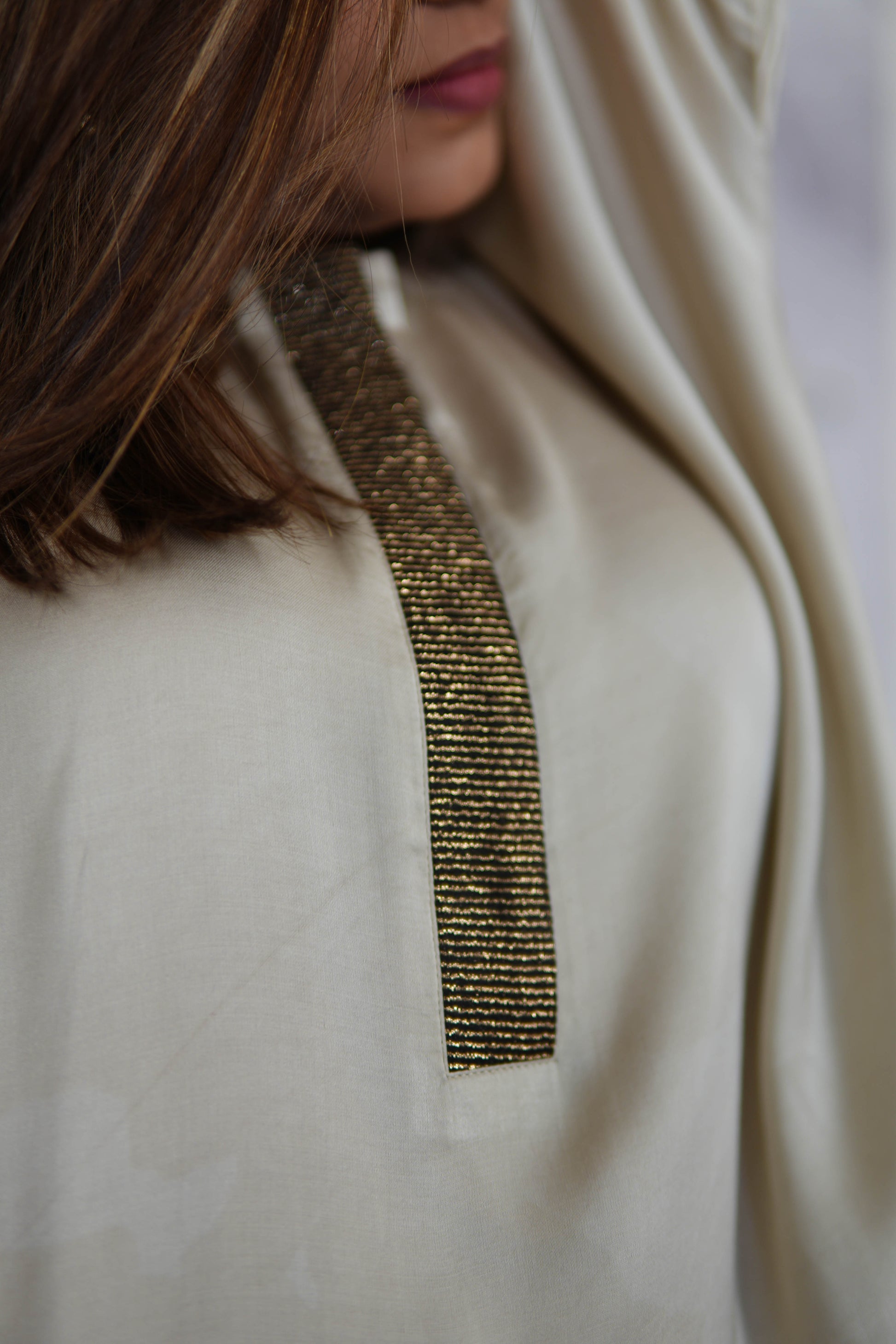 This ensemble is tailored in lustrous Modal Silk, celebrated for its fluid fall and delicate sheen that echoes the sophistication of heritage textiles. The ivory canvas serves as a serene base, allowing the metallic embellishments to take centre stage.
