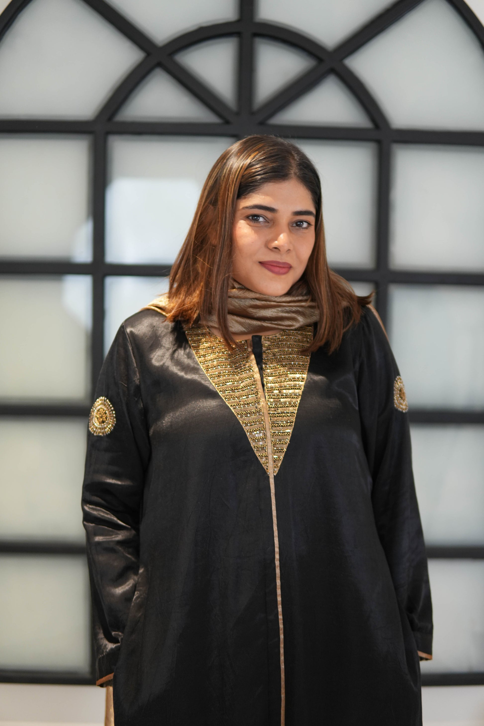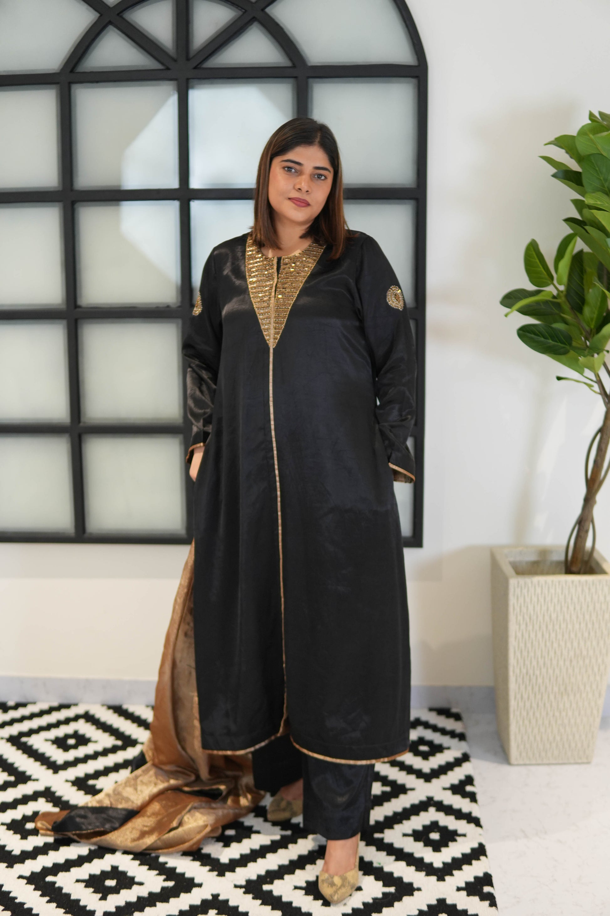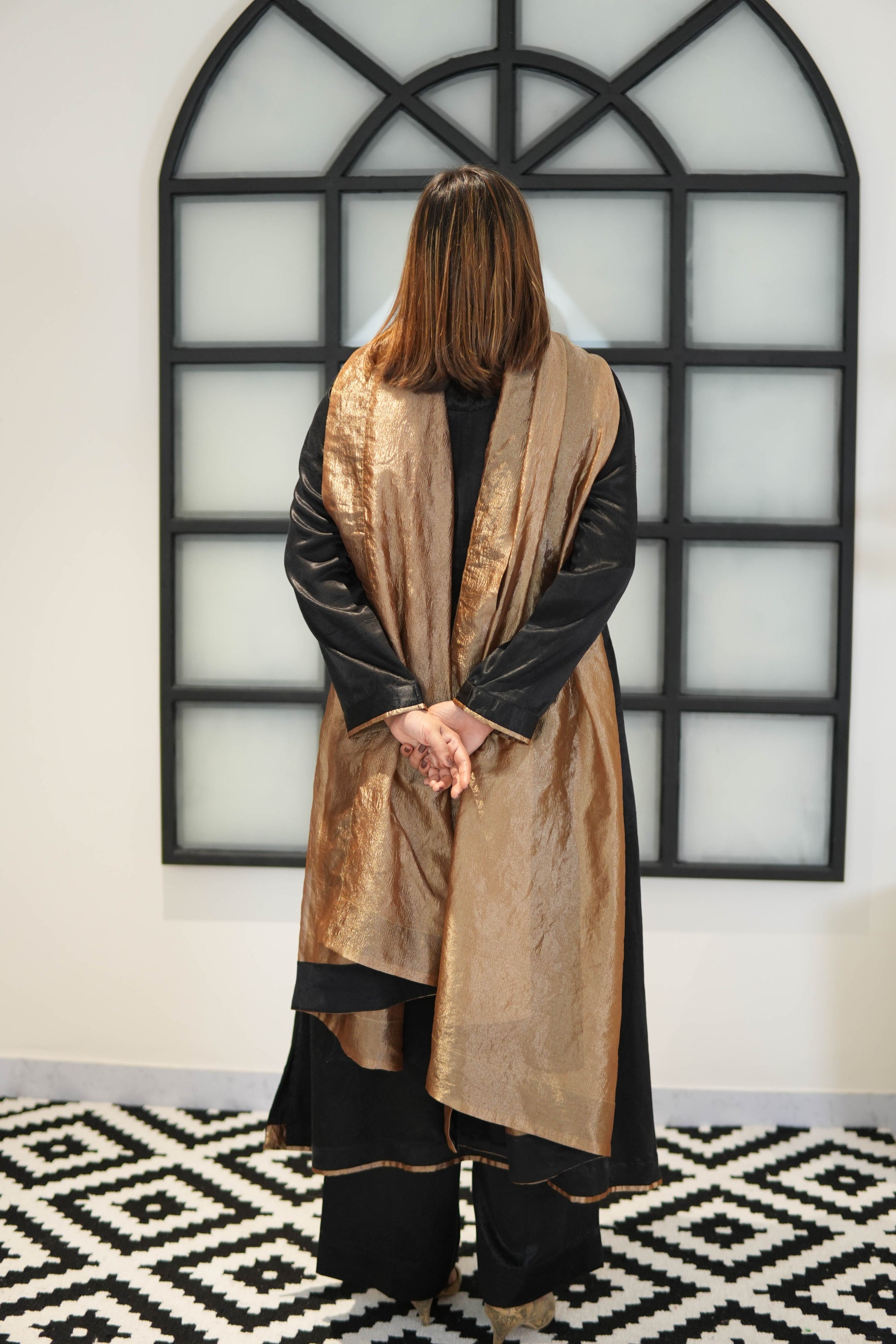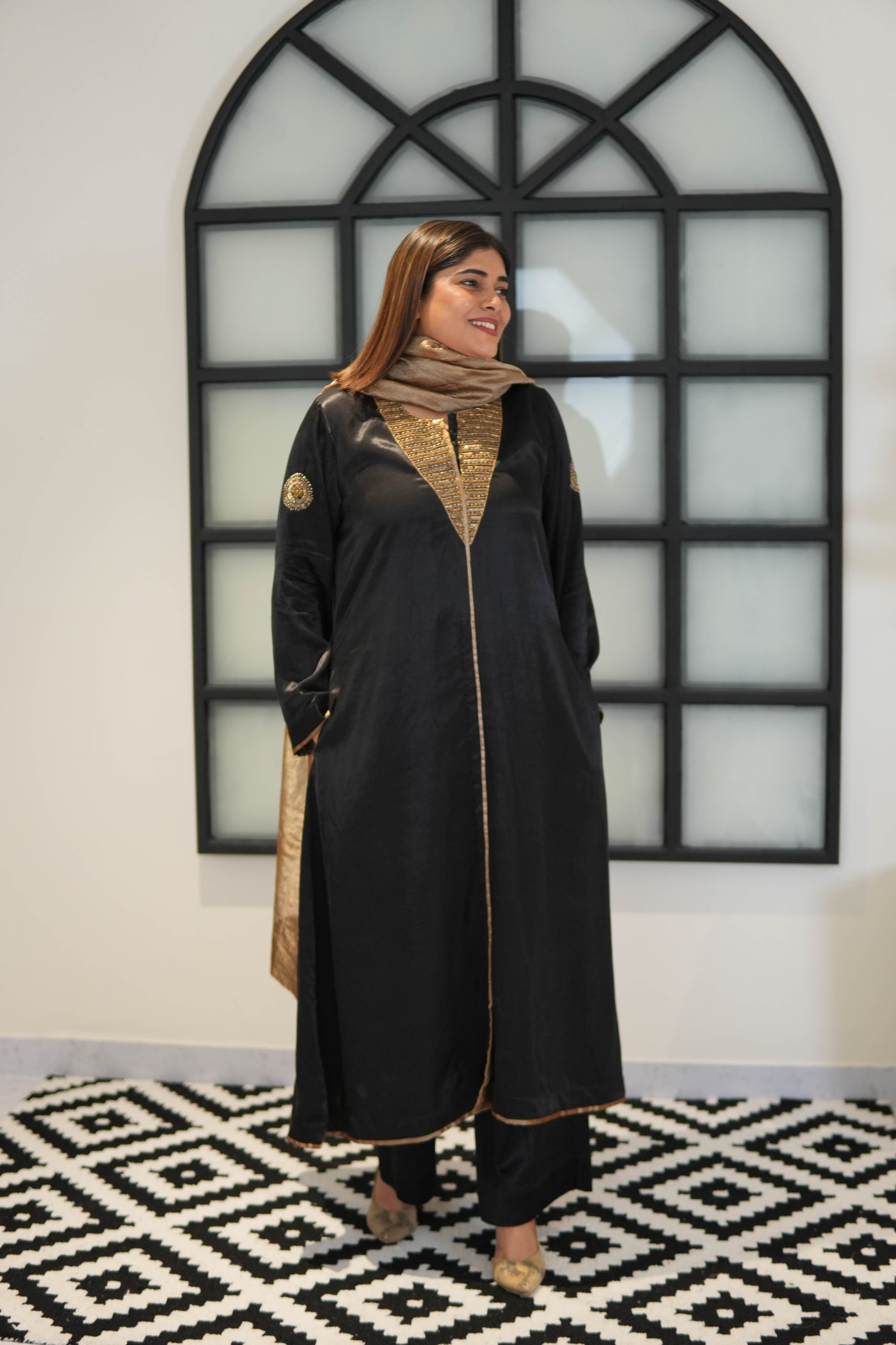 A vision of timeless grace, our Noor-e-Shaam tailored from luxurious Mashru silk, known for its smooth lustre and fluid drape. The ensemble features a long A-line kurta silhouette in deep Black, highlighted with an intricately hand-embroidered antique gold yoke crafted with sequins and zari threadwork for a touch of regal opulence.