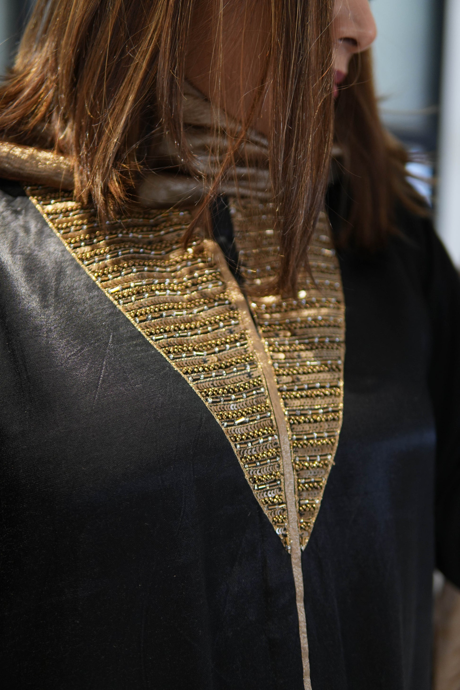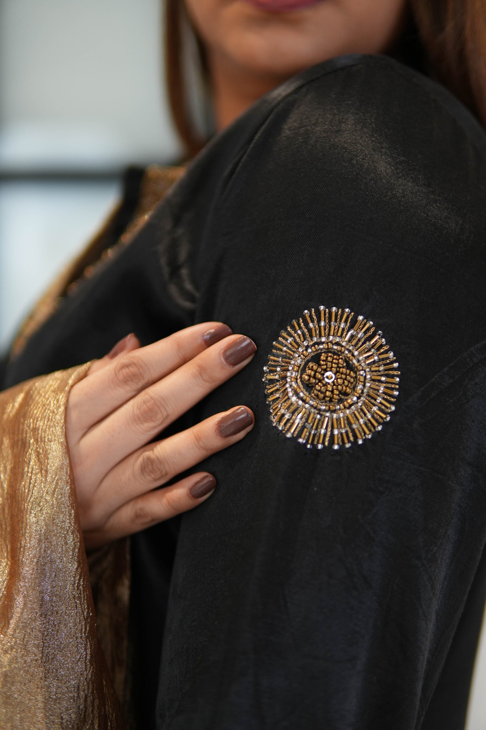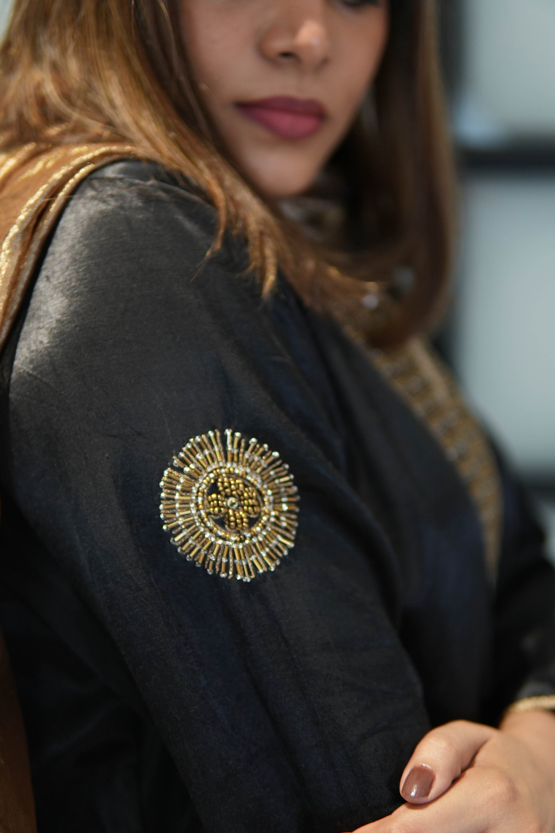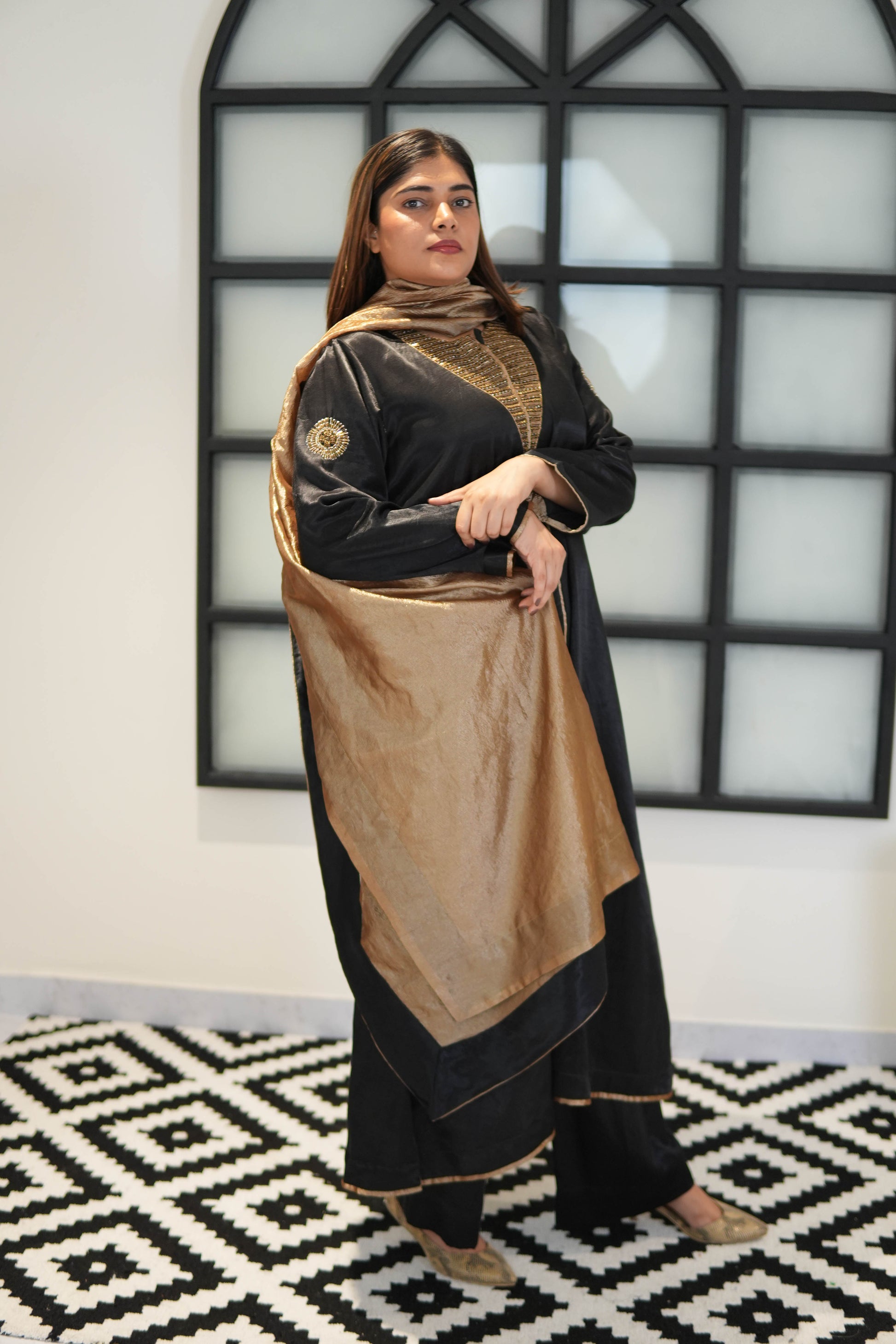 A vision of timeless grace, our Noor-e-Shaam tailored from luxurious Mashru silk, known for its smooth lustre and fluid drape. The ensemble features a long A-line kurta silhouette in deep Black, highlighted with an intricately hand-embroidered antique gold yoke crafted with sequins and zari threadwork for a touch of regal opulence.