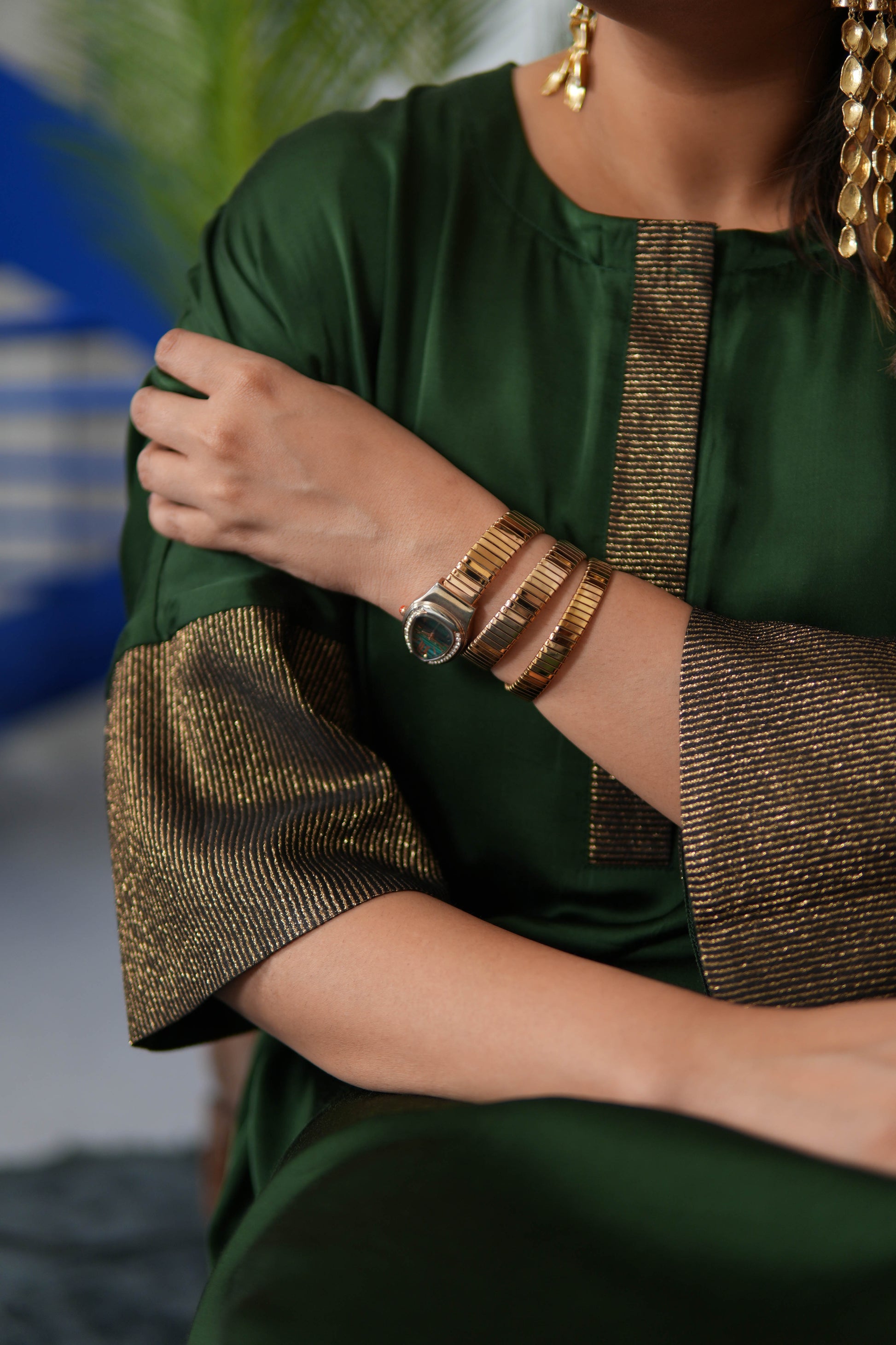 The Noor-e-Sabz is crafted from emerald green modal silk, prized for its fluid drape and subtle sheen. The kurta features a closed ghera A-line silhouette with a round neckline enhanced by a vertical metallic zari panel, creating an elongating effect. The highlight lies in the wide sleeves finished with bronze-striped zari cuffs, blending contemporary sharpness with festive grandeur.