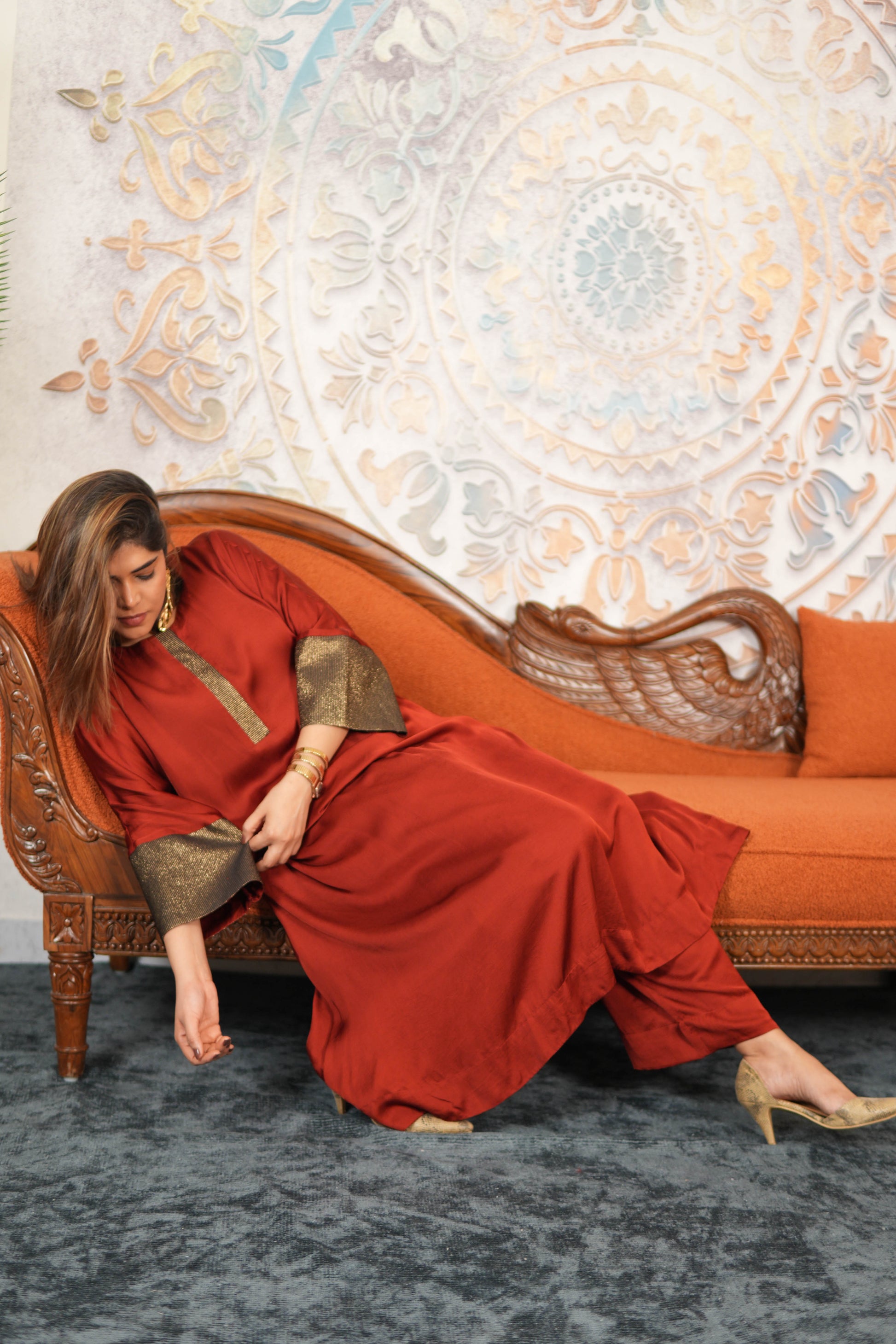 RUBY RUSSET MODAL SILK KURTA SET WITH BRONZE TISSUE DETAILING