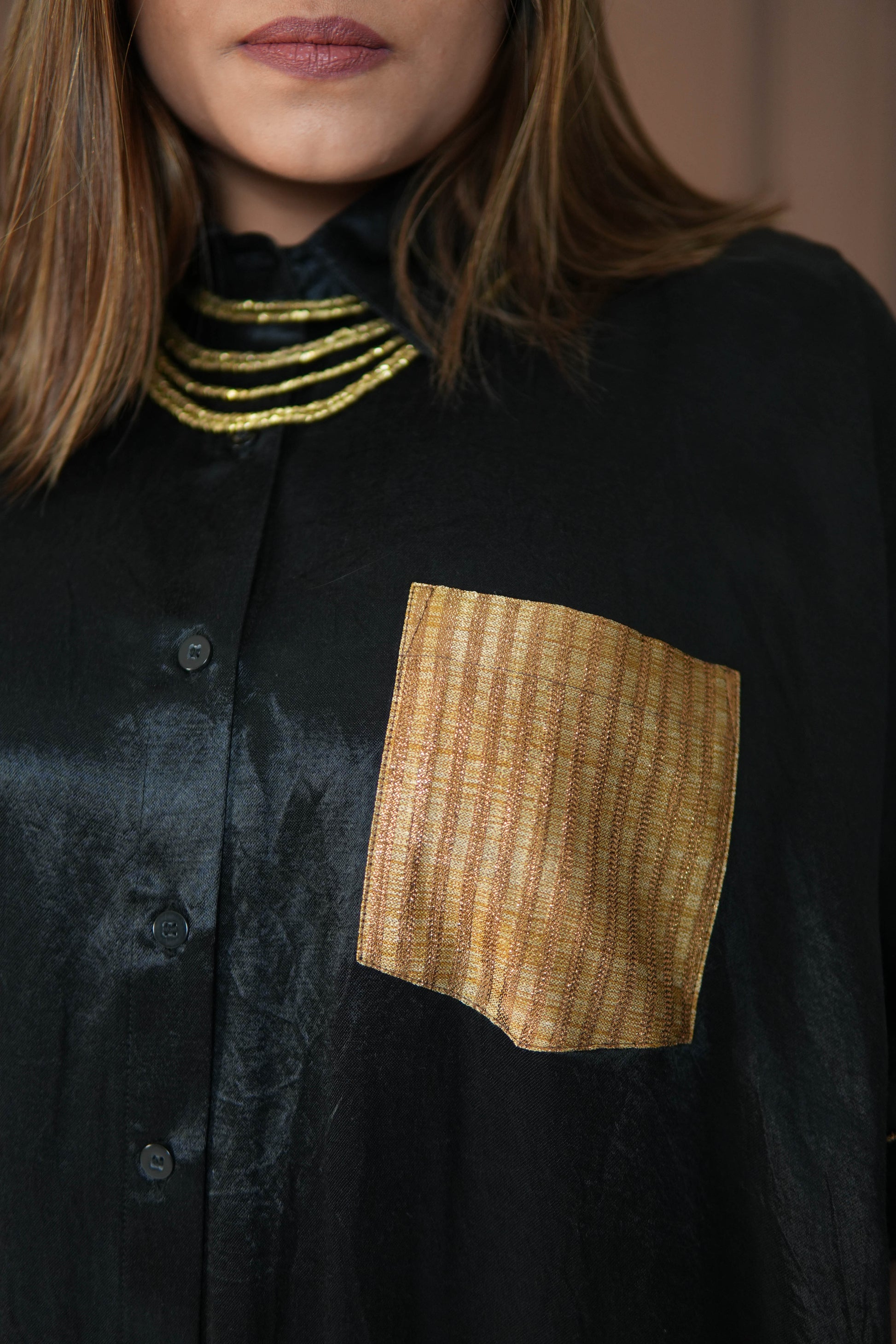 Crafted in luxurious Mashru silk, the Saanjh Black Coord Set is a celebration of rich heritage and contemporary ease. The deep black-toned shirt features a relaxed, free-size shirt with a sharp collared neckline, flowing button placket, and airy short sleeves finished with subtle golden stitch detailing. A statement metallic gold handwoven pocket adds a luminous contrast, elevating the ensemble with festive brilliance.