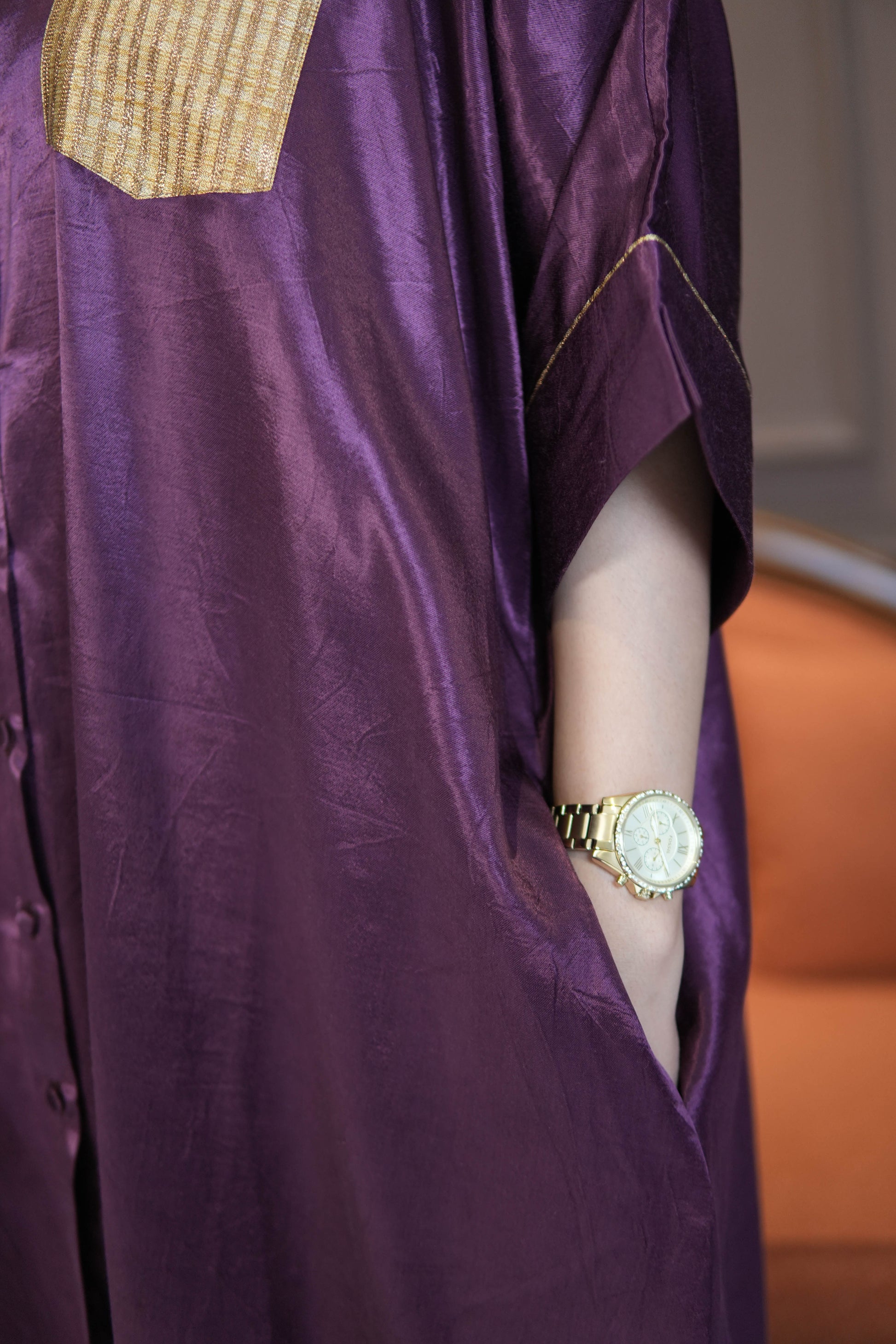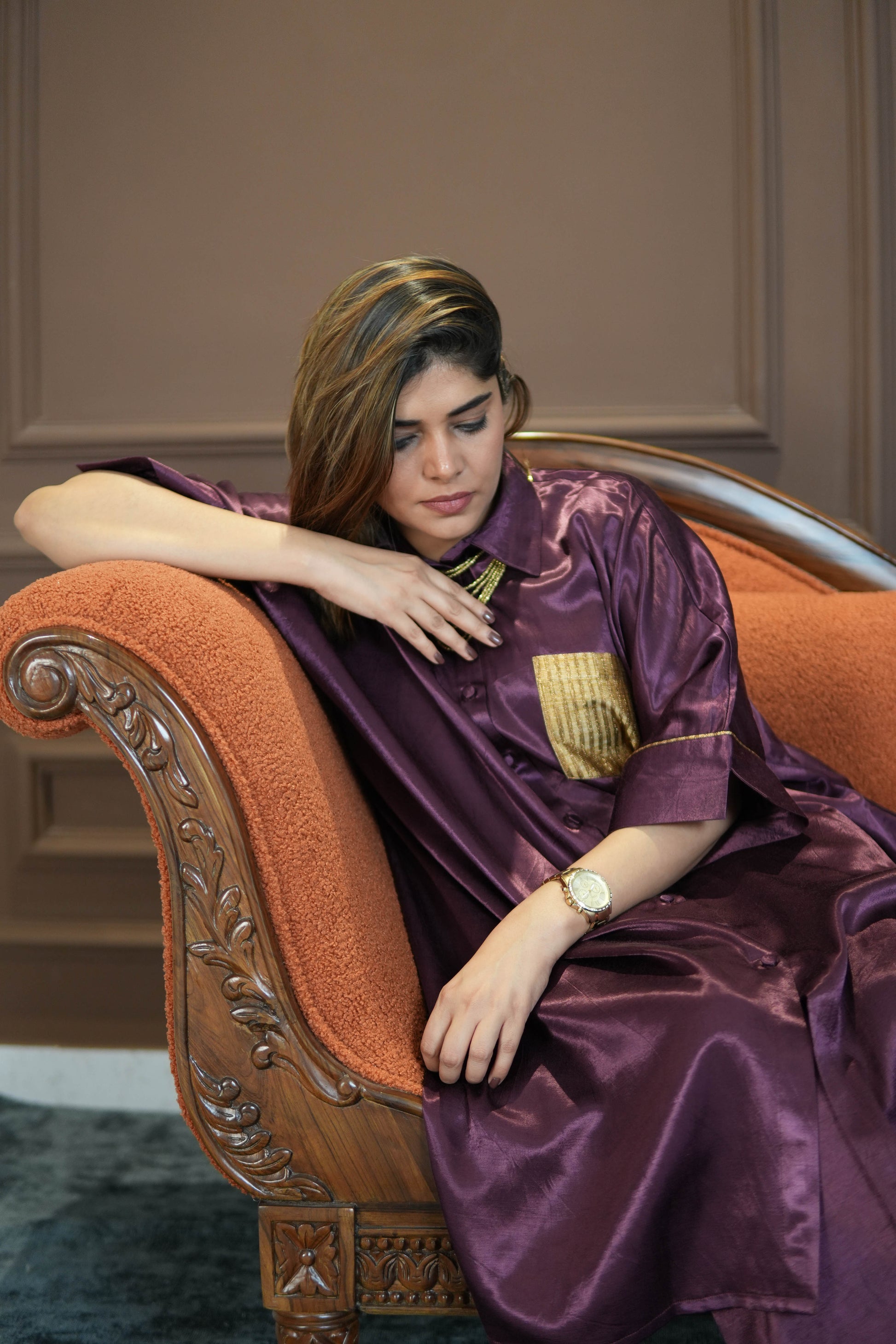 Crafted in luxurious Mashru silk, the Shafaq Coord Set is a celebration of rich heritage and contemporary ease. The deep plum-toned shirt features a relaxed, free-size shirt with a sharp collared neckline, flowing button placket, and airy short sleeves finished with subtle golden stitch detailing. A statement metallic gold handwoven pocket adds a luminous contrast, elevating the ensemble with festive brilliance.